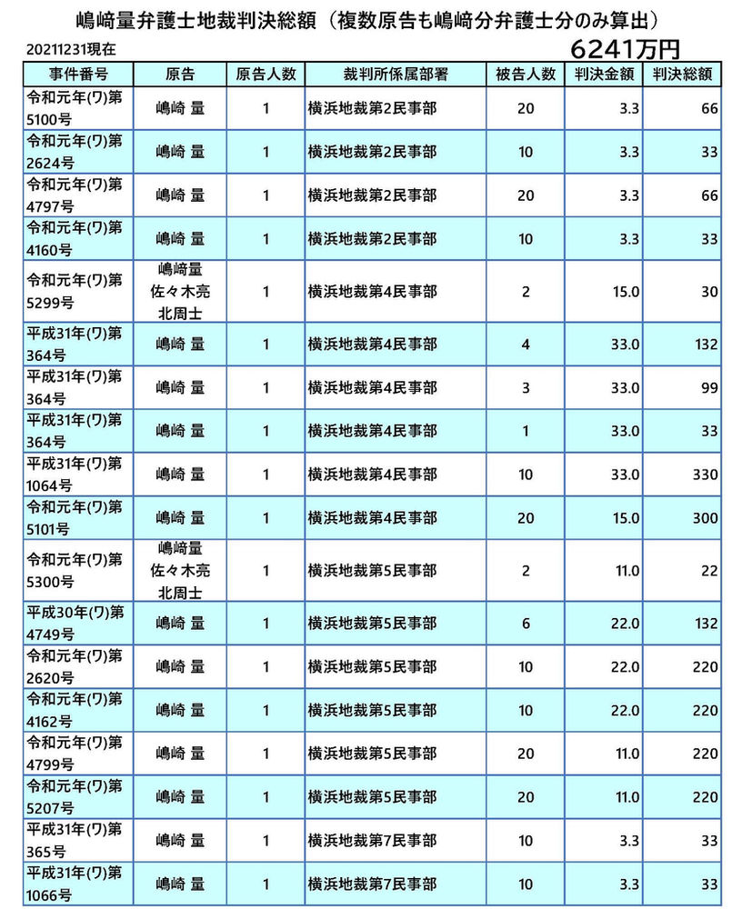 嶋﨑量弁護士は判決金額が佐々木氏北氏と比較して少ない分、回収に異常な力を入れています。嶋﨑弁護士と同じ神奈川総合法律事務所所属の代理人西川治弁護士が非常に強烈な回収を行っていますが、それを裁判で指摘されることを嫌がっているようです。