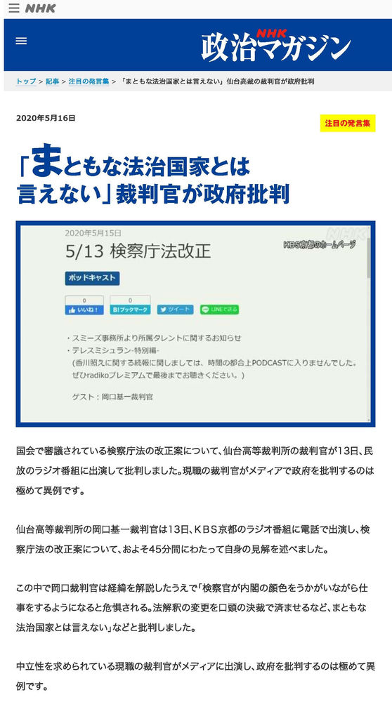NHKは、地方の民放ラジオに出演して「まともな法治国家とは言えない」と、口を極めて政府を批判した岡口裁判官についてわざわざ報道しました。