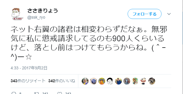 全方位に勇ましいご発言が目立つブラック弁護士の先生方の内で、その戦闘力では、やはり 落とし前・佐々木亮弁護士(旬報法律事務所) と 血祭り・嶋﨑量弁護士(神奈川総合法律事務所)が飛び抜けていて、他の追随を許していないようです。