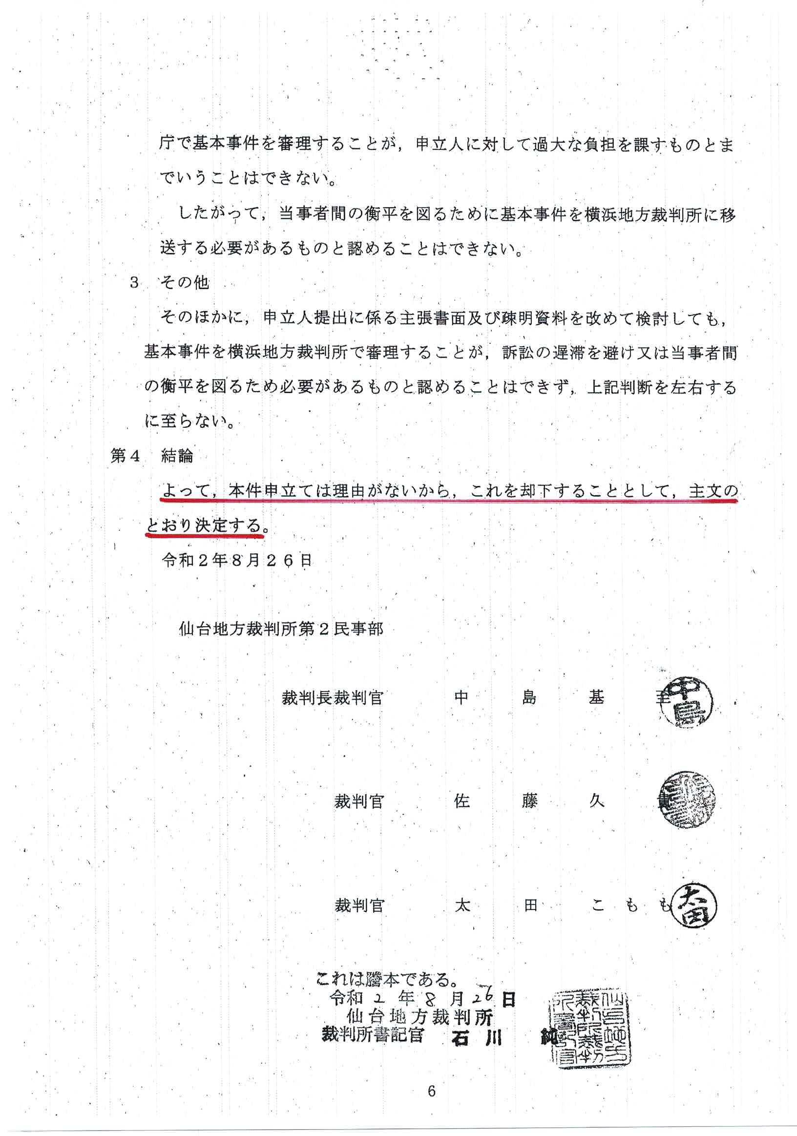 神奈川県弁護士会4名と嶋﨑量以下10名の弁護士のプライバシー侵害損害賠償事件移送申し立てが却下された。完膚なきまでの叩かれようで、面目丸つぶれである。