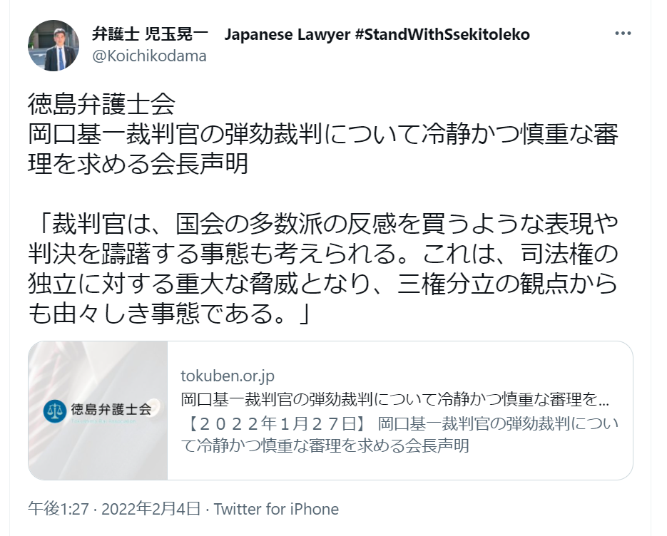 ちなみに反政府的な会長声明を多数発出している弁護士会は、岡口基一判事応援