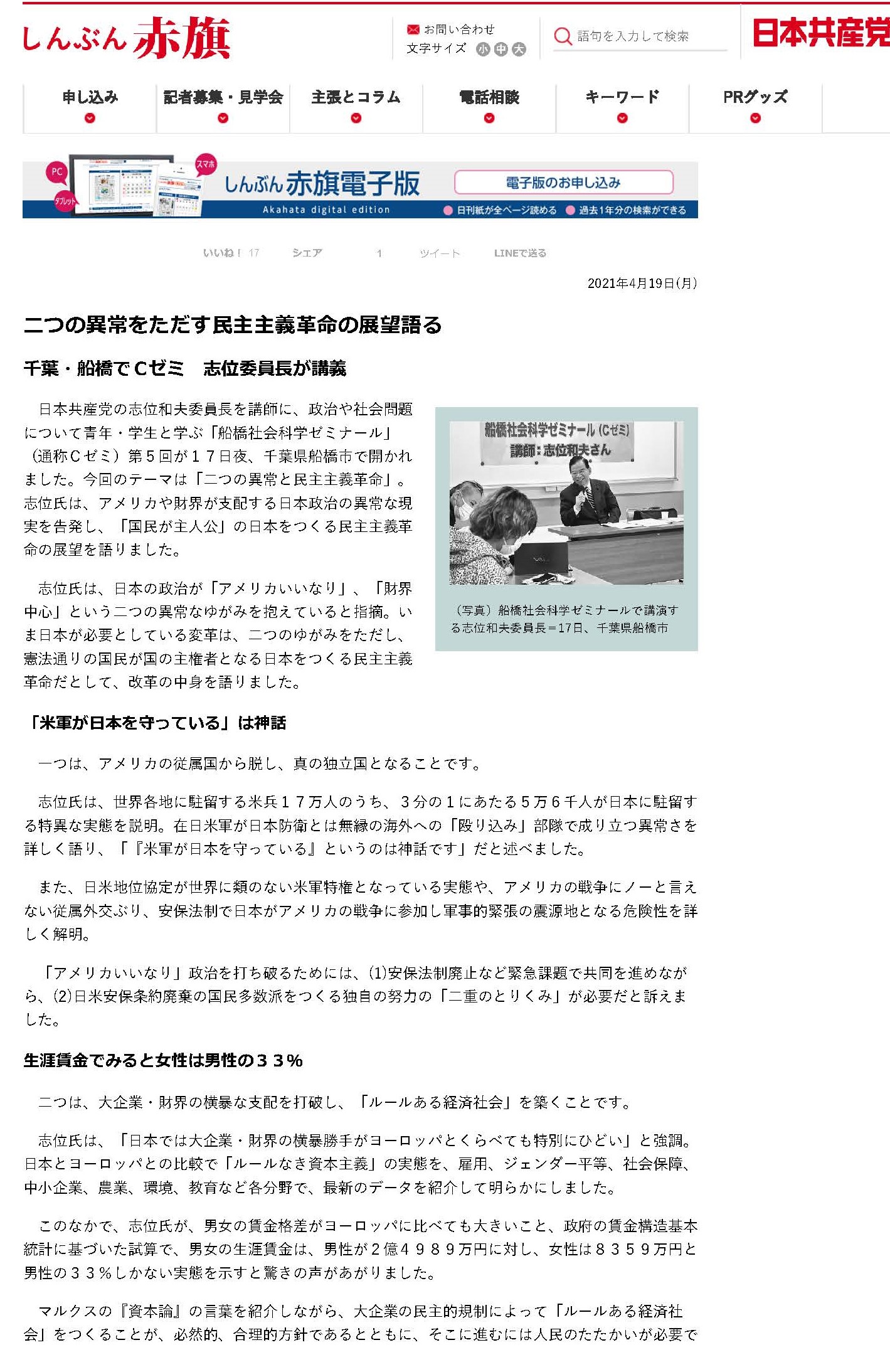 千葉・船橋でCゼミ 志位委員長が講義 しんぶん赤旗2021年4月19日(月)