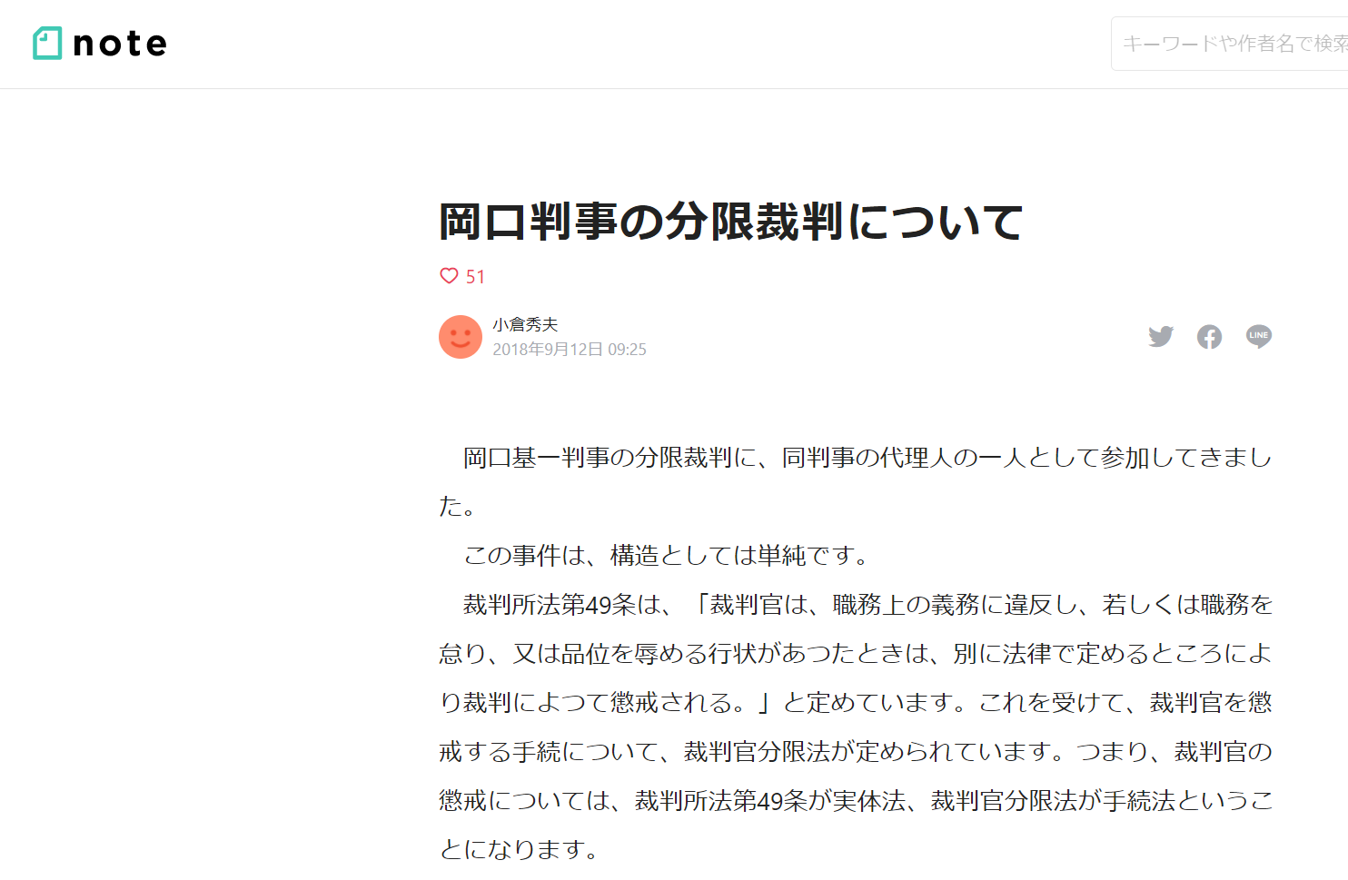 あらら、小倉秀夫先生ったら岡口基一判事の代理人で弁護団に入っていて、擁護するノートまで書いてるじゃない。ってことは、懲戒請求の原告&代理人弁護士ズは岡口判事の味方、低い認容判決と棄却を出した裁判官は敵って分類を小倉センセはしてるわけね。