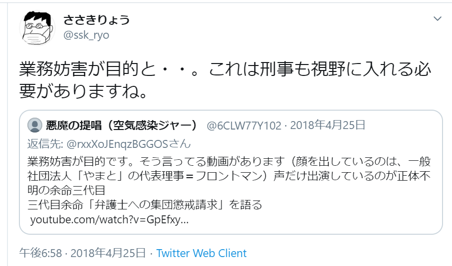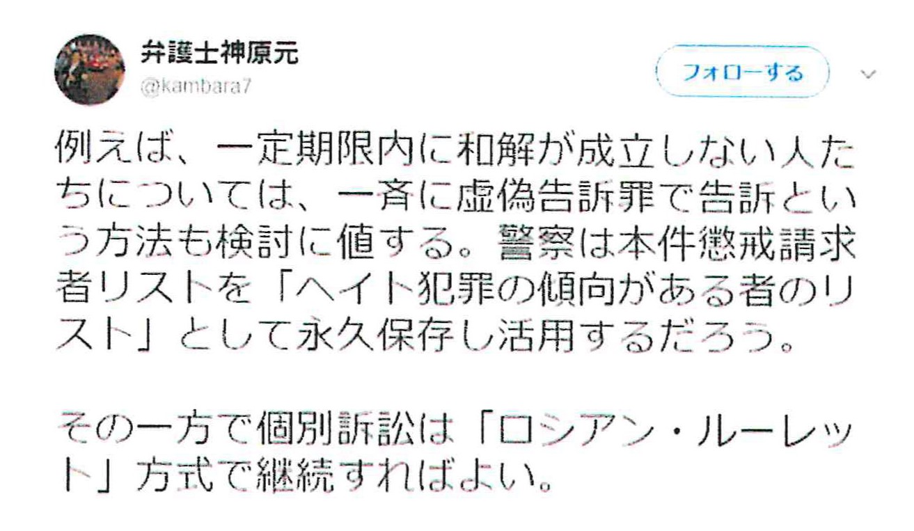 そして指摘された問題全てを無視して懲戒請求者を追い詰め、その途中で「本件ブログ主」の刑事責任を追及すると大声で発信した原告弁護士は非常に罪深いと考えるものである。