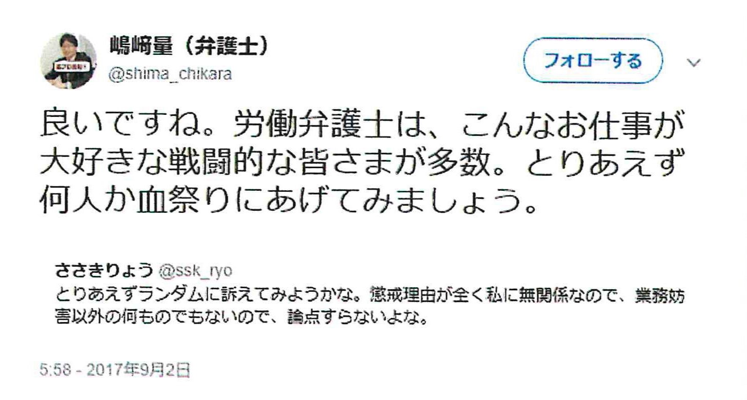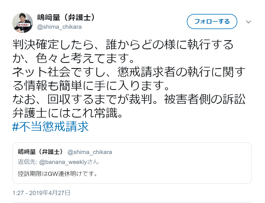 なお、嶋﨑量弁護士は確定してから執行すると虚偽のツイートをしている。