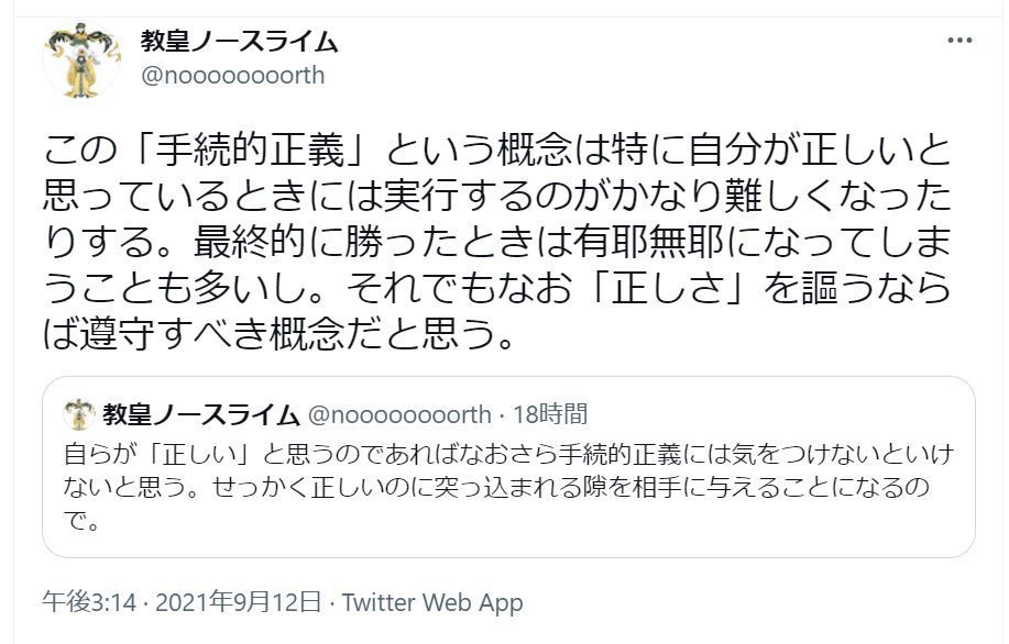 なにやら、手続的正義とやらを熱心に「自分は正しい!」と主張していらっしゃいます。