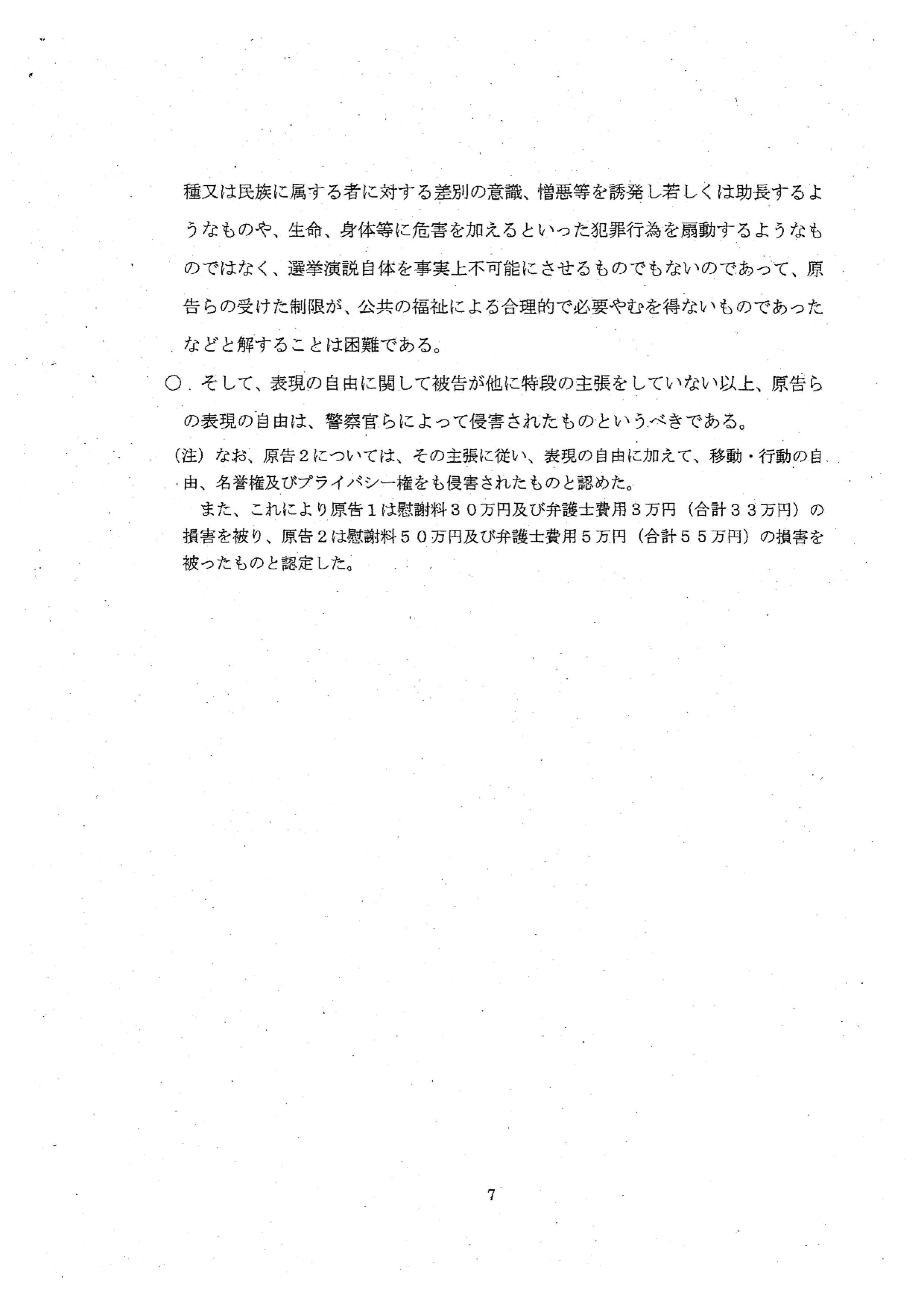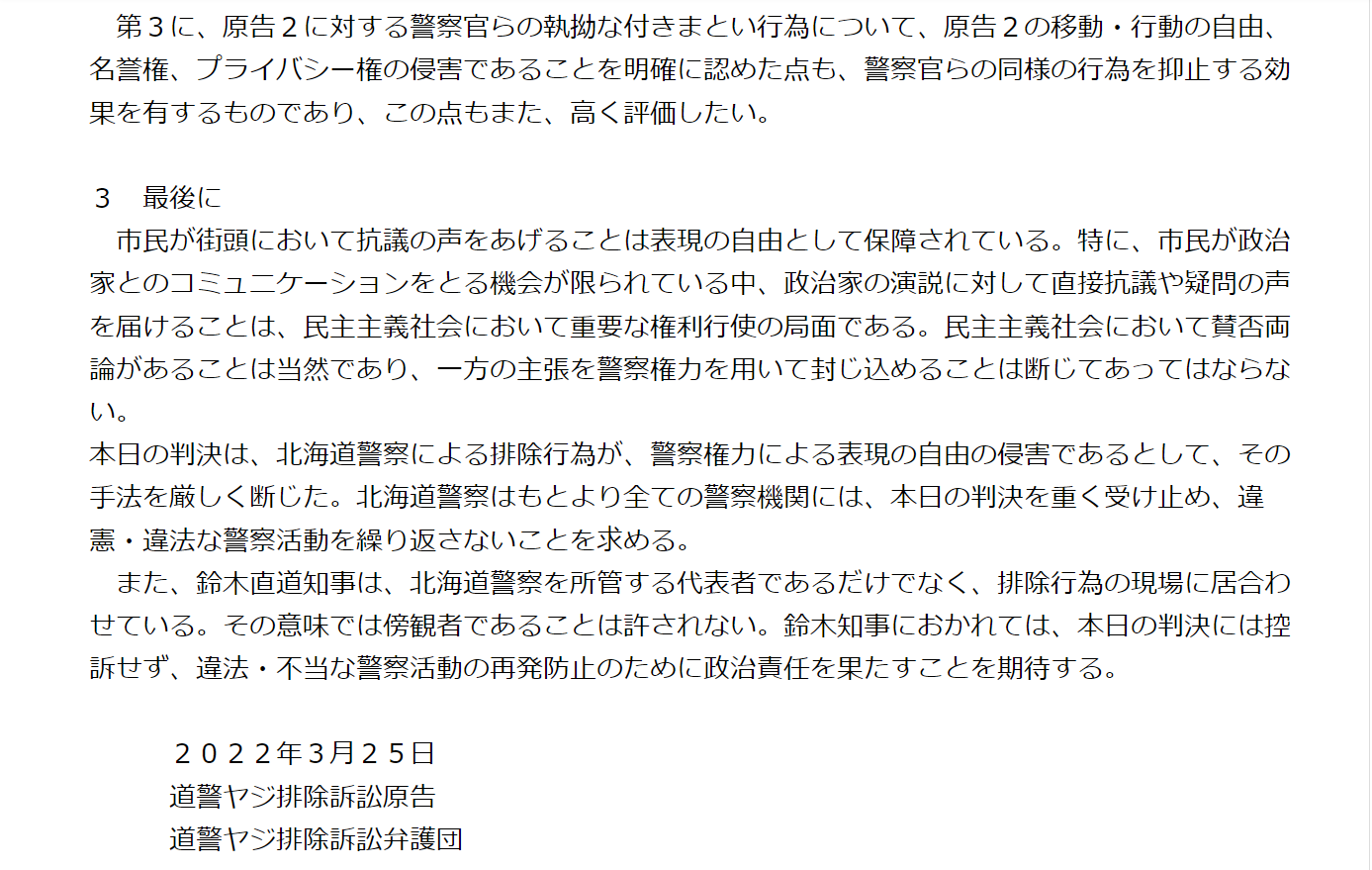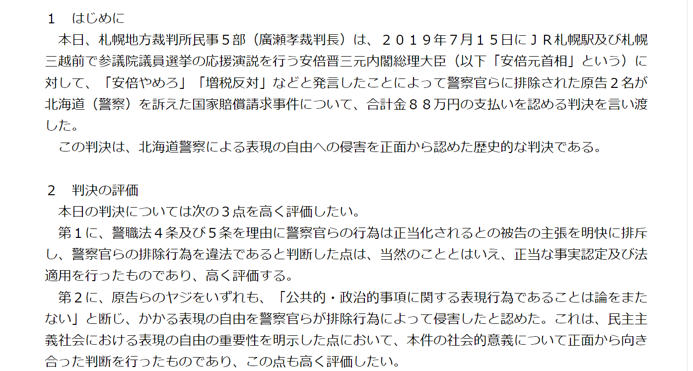 853 札幌地裁ヤジ排除違法判決要旨と弁護団声明
