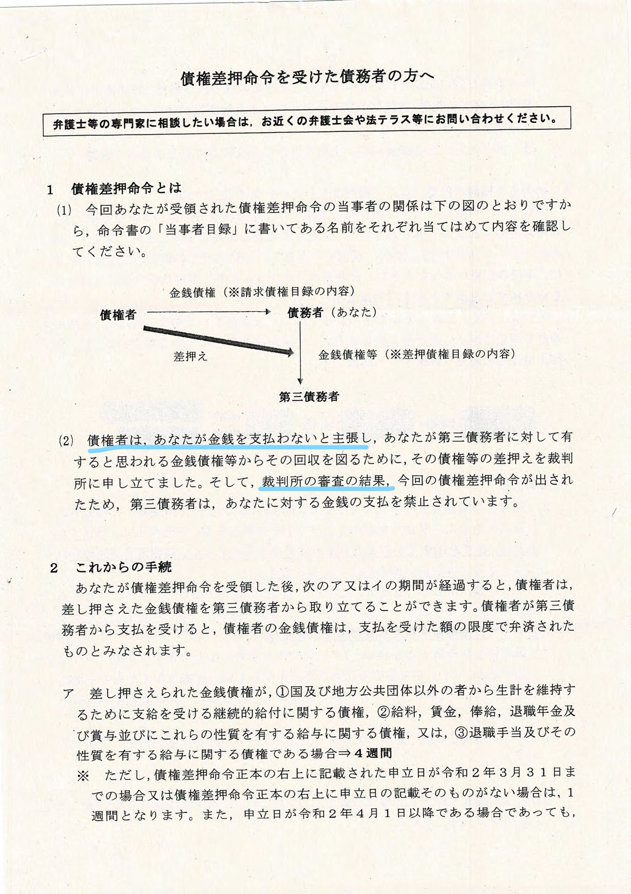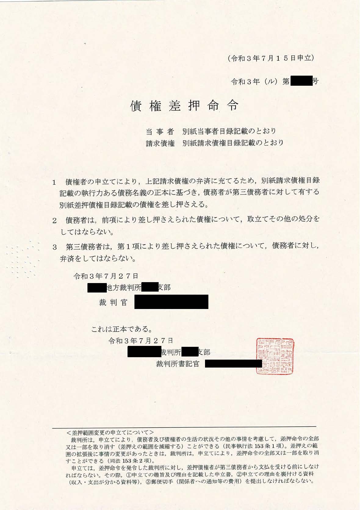 ・債権差押命令を受けた債務者の方へという裁判所の書面には、明確に「債権者は、あなたが金銭を支払わないと主張し」「裁判所の審査の結果、今回の差押命令が出された」とあるが、それは事実ではなく金銭は支払われています。