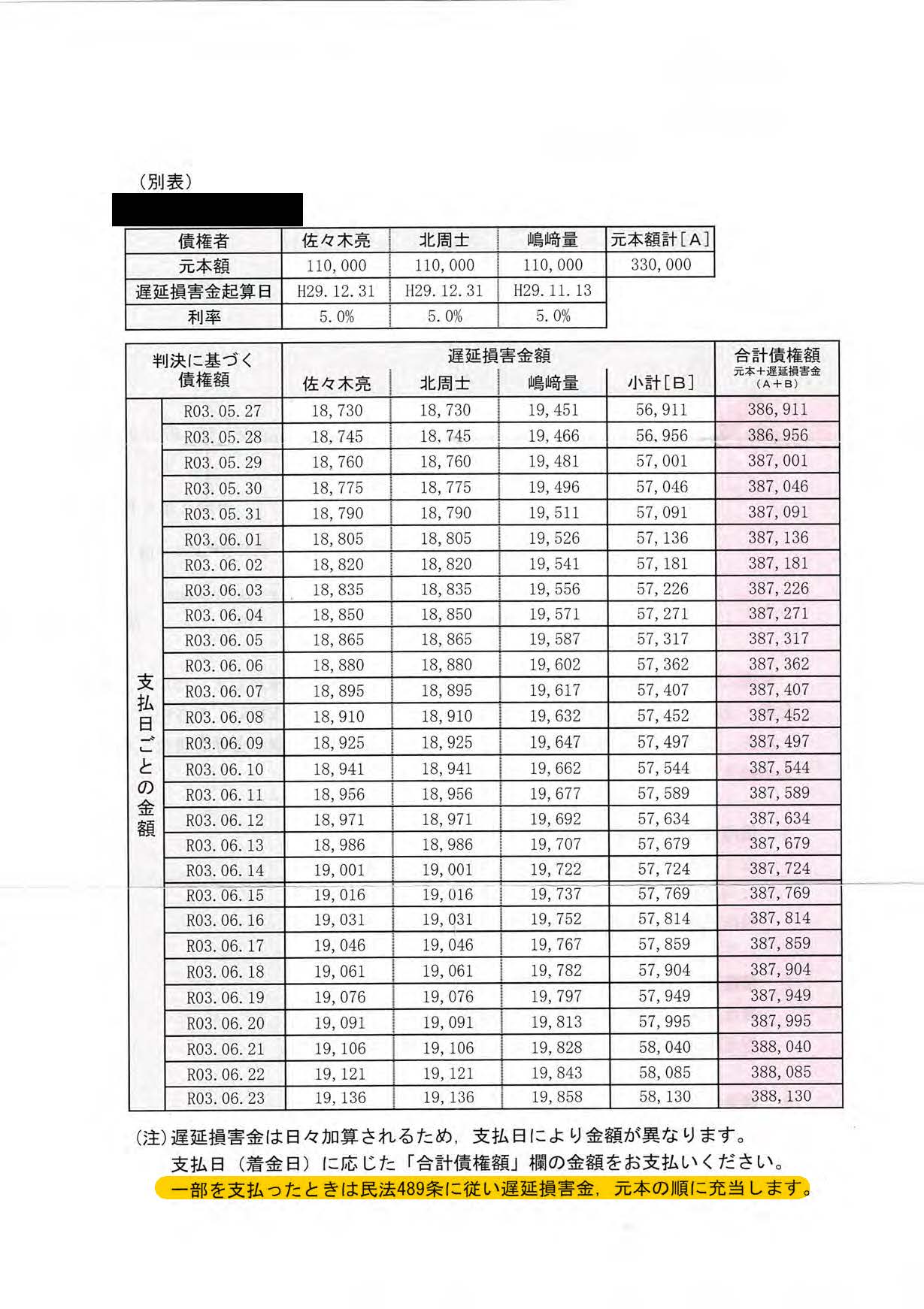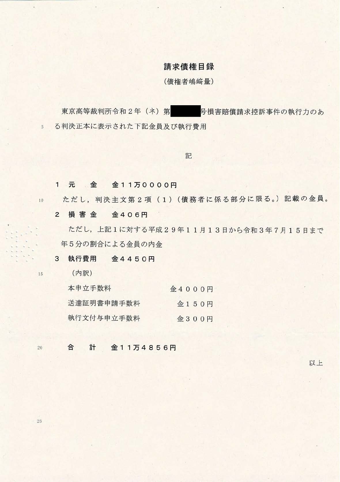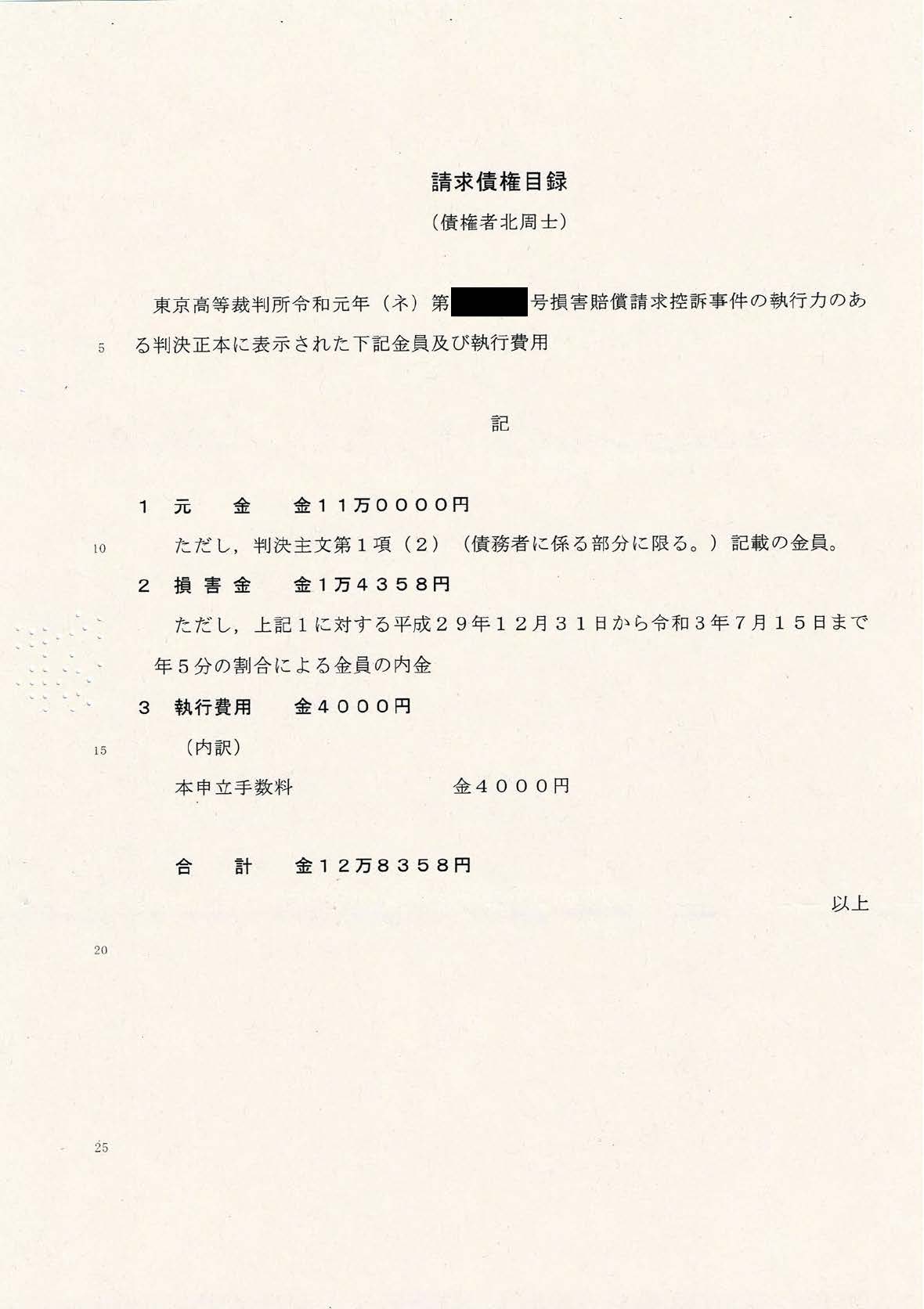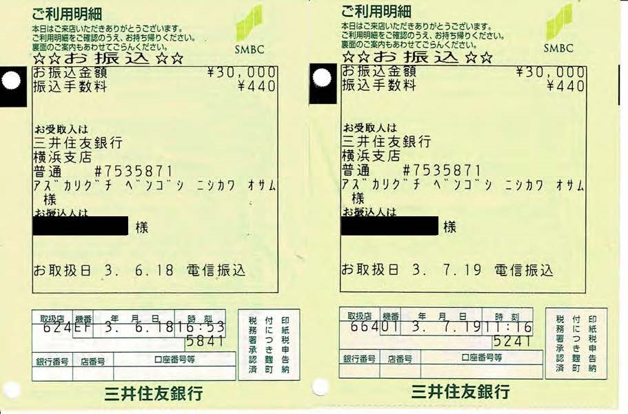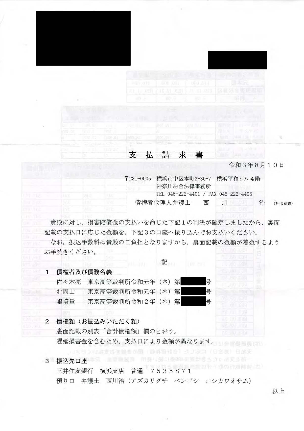 前述したとおり、私は裁判所より原告弁護士ら3名に賠償金を支払うように命ぜられ、5月末に原告の代理人より賠償金の支払い請求書を受け取りました。法治国家に暮らす一民草として、今なお裁判に大きな問題があり判決には不服という思いを抱えつつも、最初から裁判所の命令や支払い請求には従うつもりでした。原告代理人からの請求書には債務名義や債権額、振込先情報のほか「一部を支払ったときは民法489条に従い遅延損害金、元本の順に充当します」という普通に読めば分割払いも受け付けていると誰もが判断できる記述がありました。そしてその記述を信用して6月中旬、7月中旬にそれぞれ3万円の入金を行いました。私の収入はごく一般水準であることや常識的な家計感覚、加えてこのご時世を鑑みてみれば決して軽い負債ではないし、このまま続けていれば元本に遅延損害金を含めても一年程度あれば全額弁済できる程度の入金額でした。