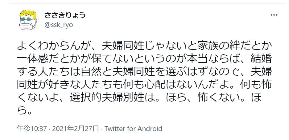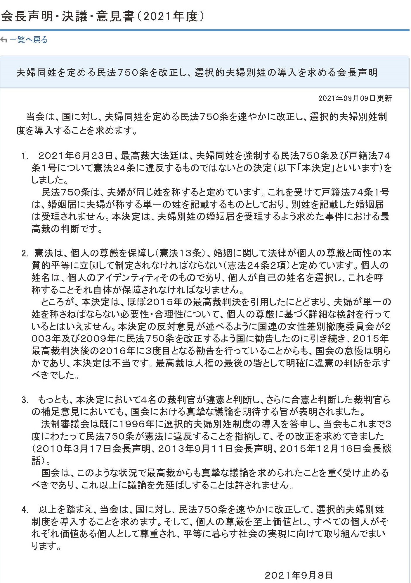 じゃ、今日はどうでもいいような夫婦別姓の声明。なんでそんなにこだわるかな。