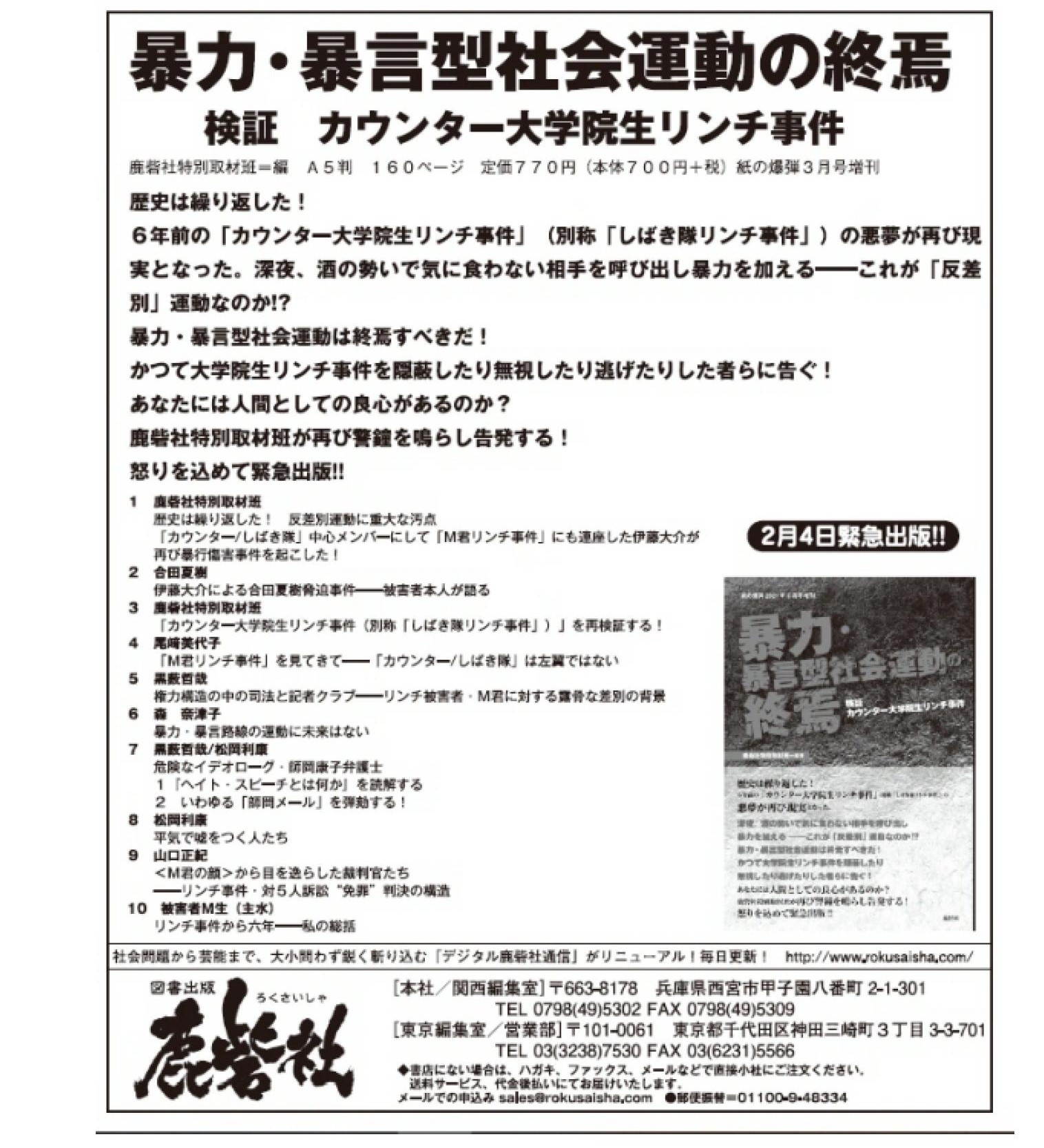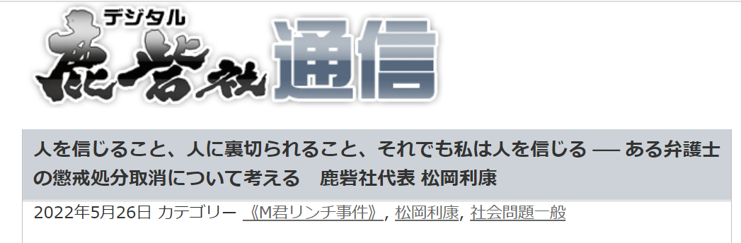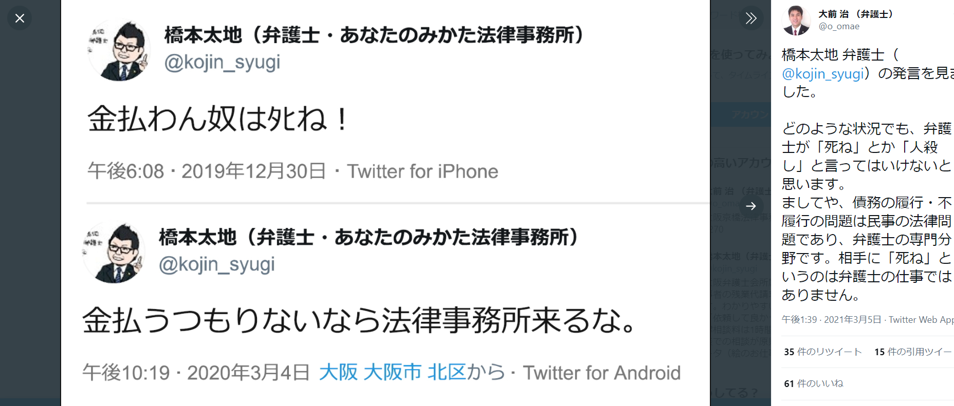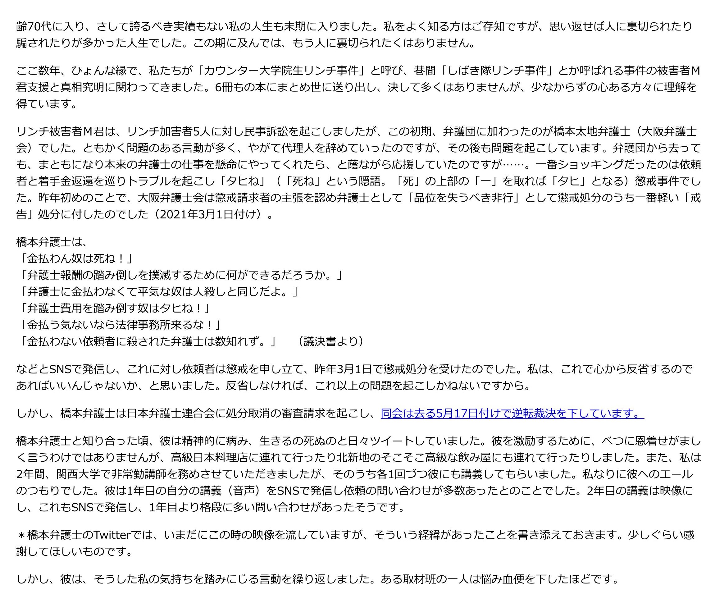 『リンチ被害者M君は、リンチ加害者5人に対し民事訴訟を起こしましたが、この初期、弁護団に加わったのが橋本太地弁護士(大阪弁護士会)でした。ともかく問題のある言動が多く、やがて代理人を辞めていったのですが、その後も問題を起こしています。弁護団から去っても、まともになり本来の弁護士の仕事を懸命にやってくれたら、と蔭ながら応援していたのですが……。一番ショッキングだったのは依頼者と着手金返還を巡りトラブルを起こし「タヒね」(「死ね」という隠語。「死」の上部の「一」を取れば「タヒ」となる)懲戒事件でした。昨年初めのことで、大阪弁護士会は懲戒請求者の主張を認め弁護士として「品位を失うべき非行」として懲戒処分のうち一番軽い「戒告」処分に付したのでした(2021年3月1日付け)。』
