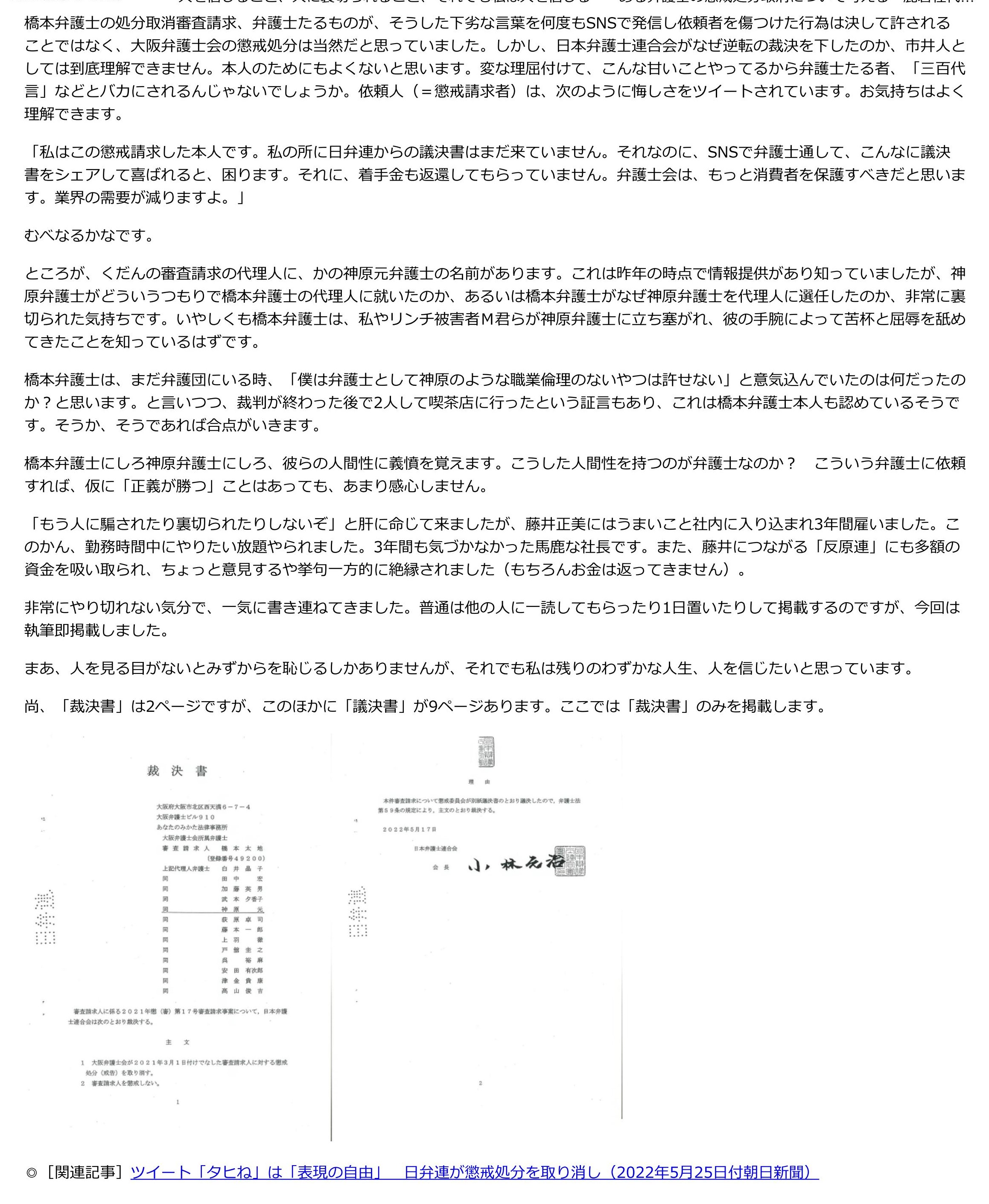 『橋本弁護士の処分取消審査請求、弁護士たるものが、そうした下劣な言葉を何度もSNSで発信し依頼者を傷つけた行為は決して許されることではなく、大阪弁護士会の懲戒処分は当然だと思っていました。しかし、日本弁護士連合会がなぜ逆転の裁決を下したのか、市井人としては到底理解できません。本人のためにもよくないと思います。変な理屈付けて、こんな甘いことやってるから弁護士たる者、「三百代言」などとバカにされるんじゃないでしょうか。依頼人(=懲戒請求者)は、次のように悔しさをツイートされています。お気持ちはよく理解できます。