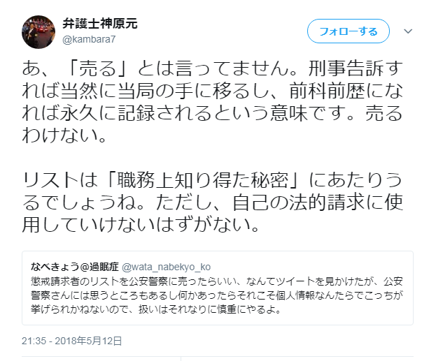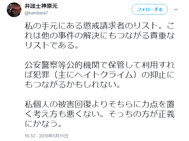 職務上請求の不正使用も、神原元弁護士(武蔵小杉合同法律事務所・神奈川弁護士会)に言わせれば正義です。このようなネトウヨコロスブラック神原先生の正義に従っていては、法律も何も意味を持ちません。