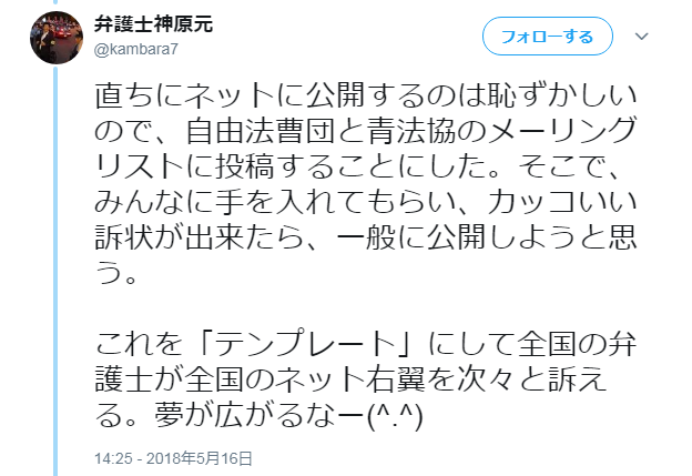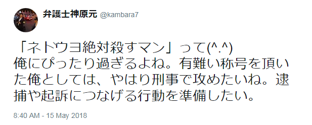 ネトウヨコロスブラック神原弁護士にとっては、法違反してもネトウヨゼッタイコロスことが正義です。正義のために弁護士活動をしているそうです。ただしその正義は神原元弁護士だけに通用する正義です。