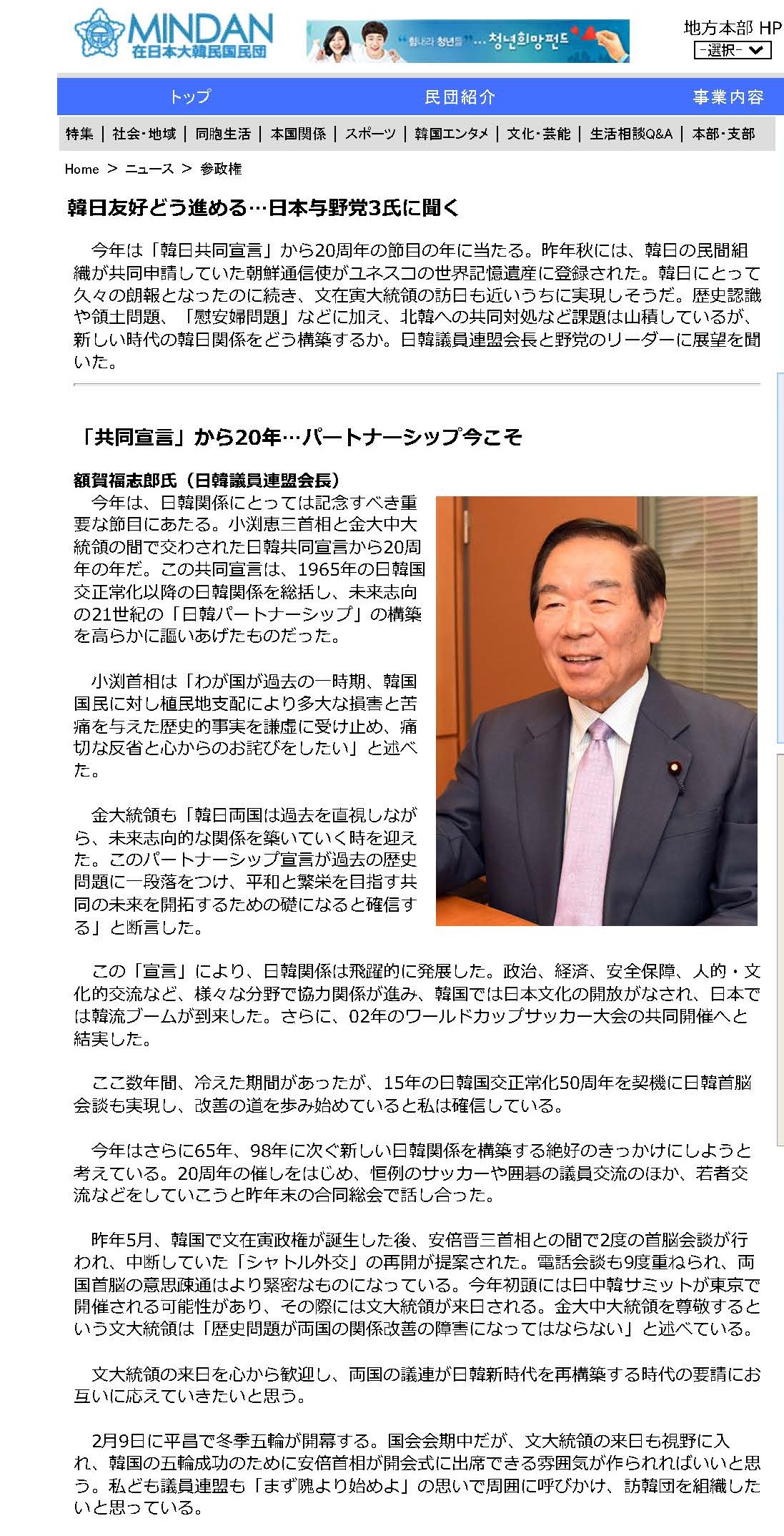 民団新聞に掲載された、韓国から非常に高く評価され信頼の厚い日本の国会議員3名を見ておきましょう。