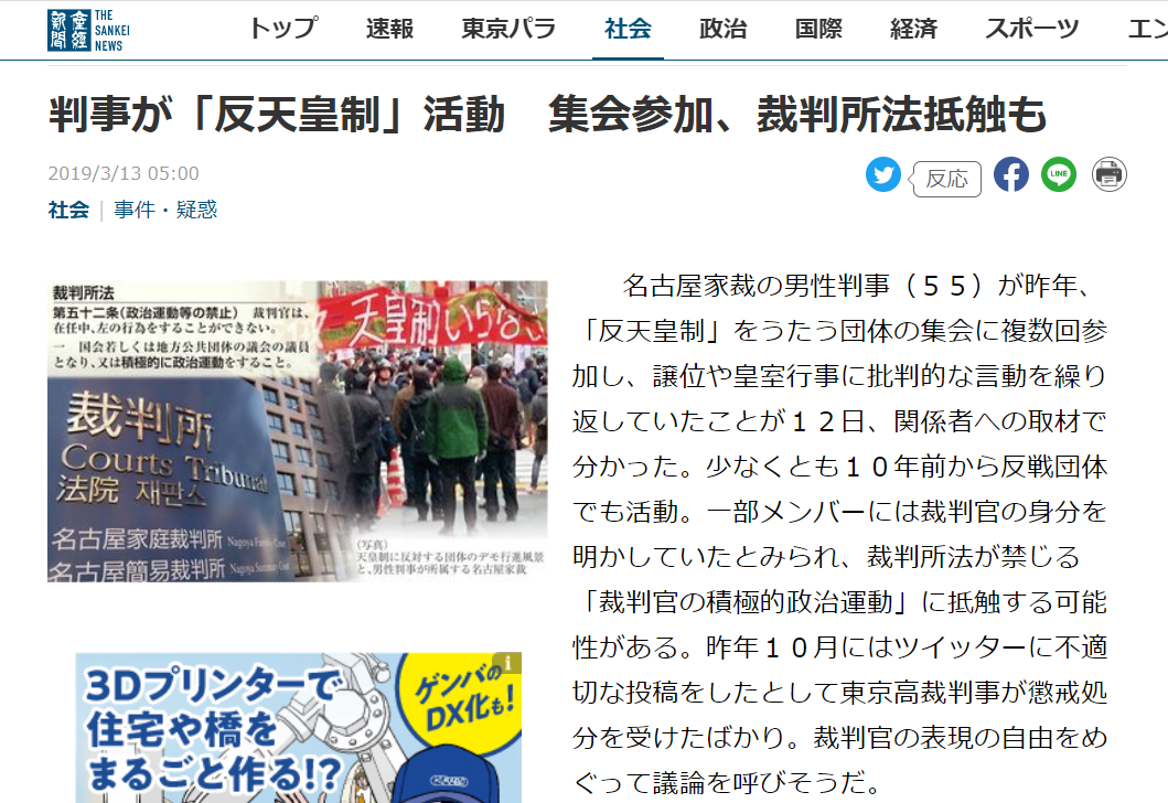関係者によると、判事は昨年7月、東京都内で行われた「反天皇制運動連絡会」(反天連、東京)などの「なぜ元号はいらないのか?」と題した集会に参加。今年6月に愛知県尾張旭市で開催され、新天皇、皇后両陛下が臨席される予定の全国植樹祭について「代替わり後、地方での初めての大きな天皇イベントになる」とし、「批判的に考察していきたい」と語った。