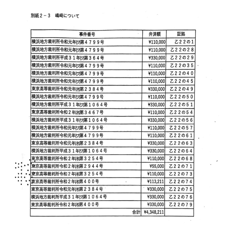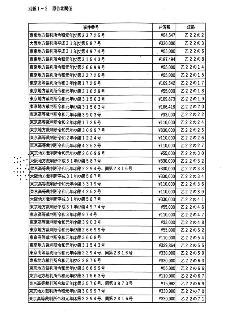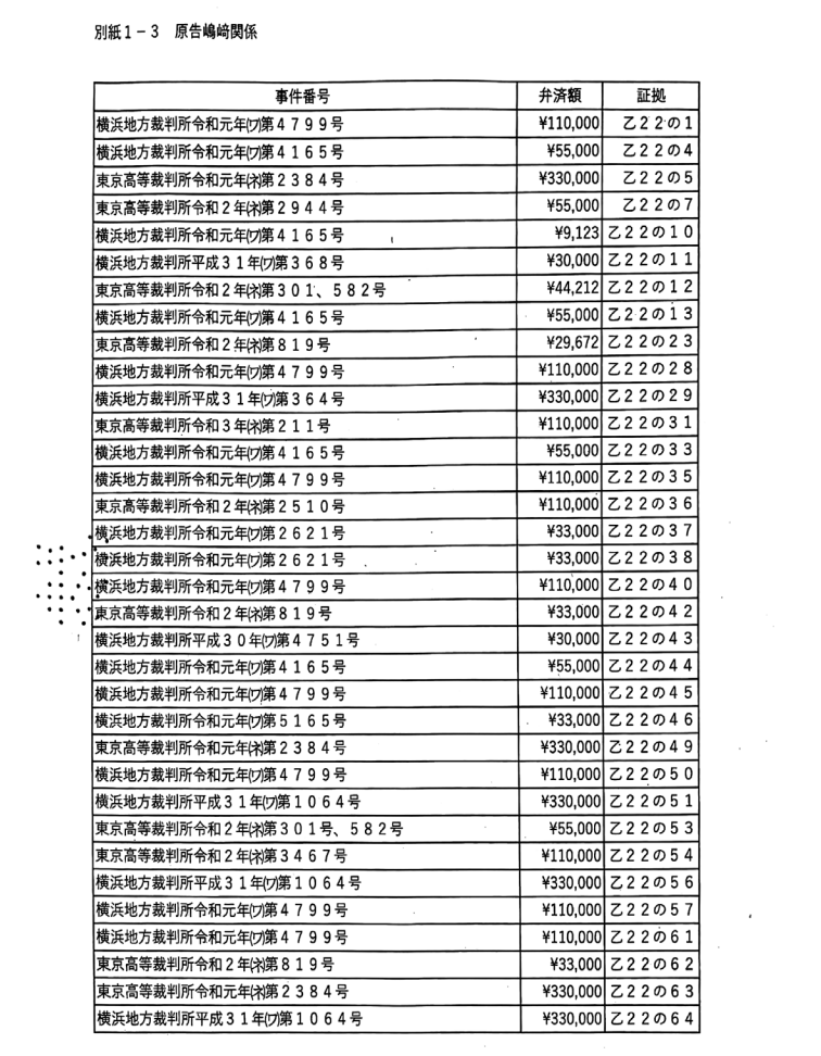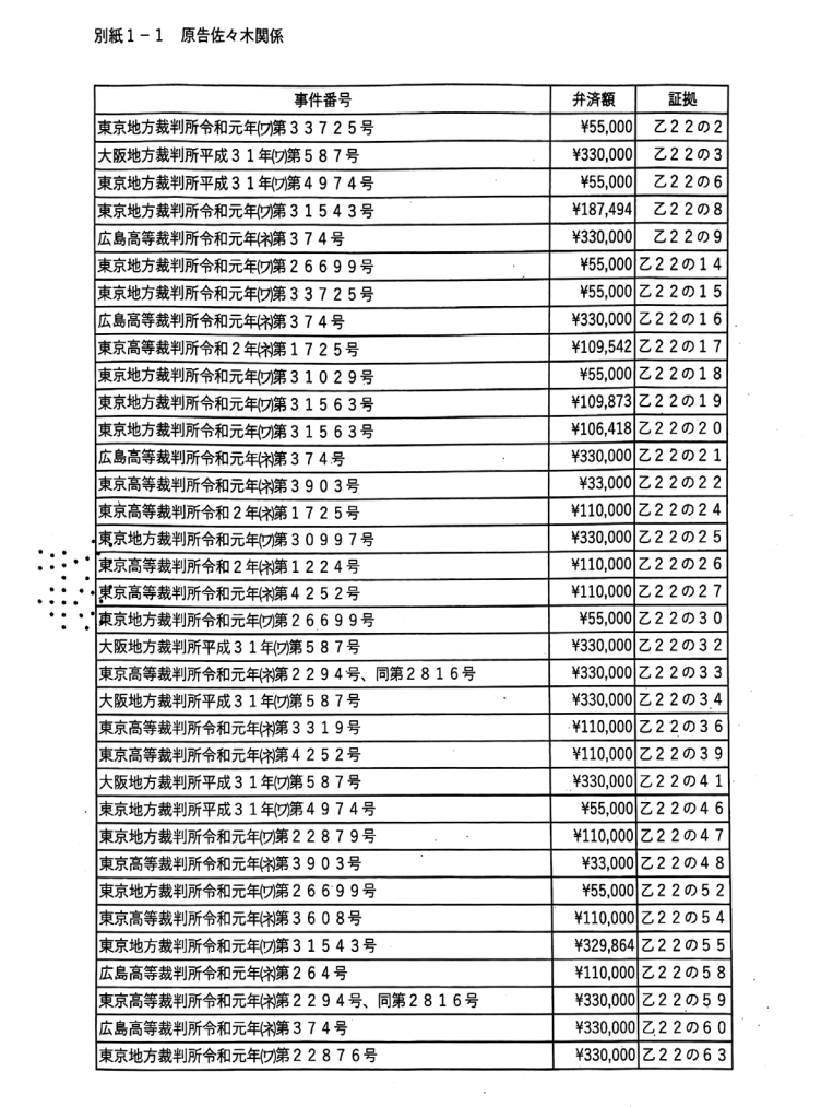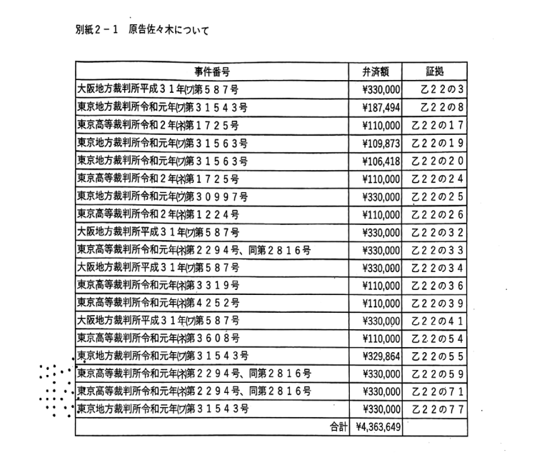 イ そして、上記⑴で認定した事実によれば、原告らは、選定者ら以外の原告らに対する懲戒請求をした者から、懲戒請求をしたことによる不法行為に基づく損害賠償債権の履行として、既に弁済を受けており、その額は、原告佐々木につき851万6183円、原告北につき631万5730円、原告嶋﨑につき600万8796円であるから(認定事実ク、原告らが、原告第1準備書面において、同種事案であることを認めた訴訟に限ってみても、別紙2の1ないし2の3のとおり、原告佐々木及び原告北は各合計436万3649円、原告嶋﨑は434万8211円の弁済を受けていることとなる。)、本件懲戒請求による不法行為に係る損害は、既に填補されており、原告らは、この額を超えて賠償を求めることはできない。