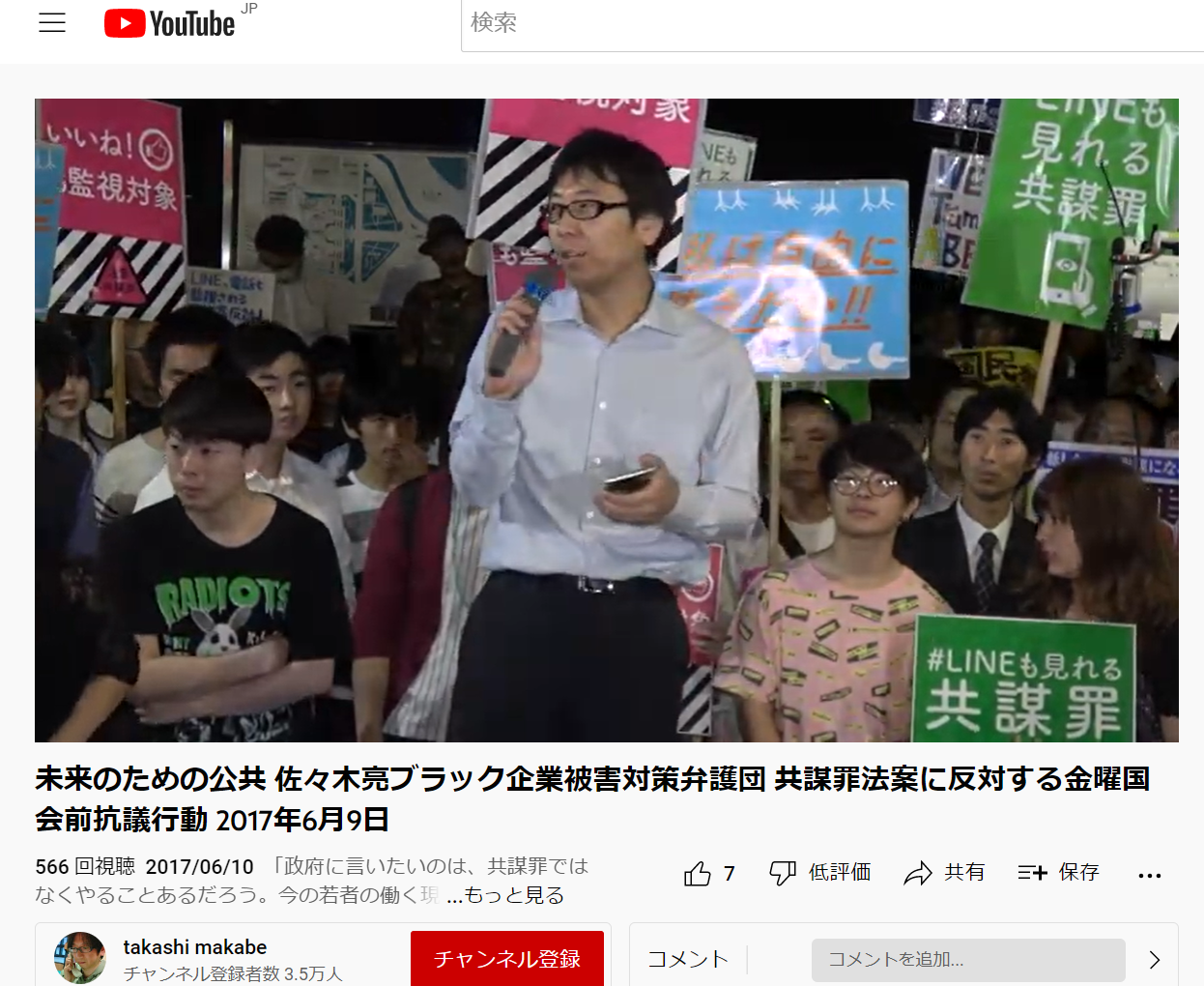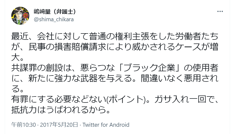 手が滑ったので、佐々木亮弁護士と嶋﨑量弁護士の「共謀罪反対」もアップしておきましょう。
