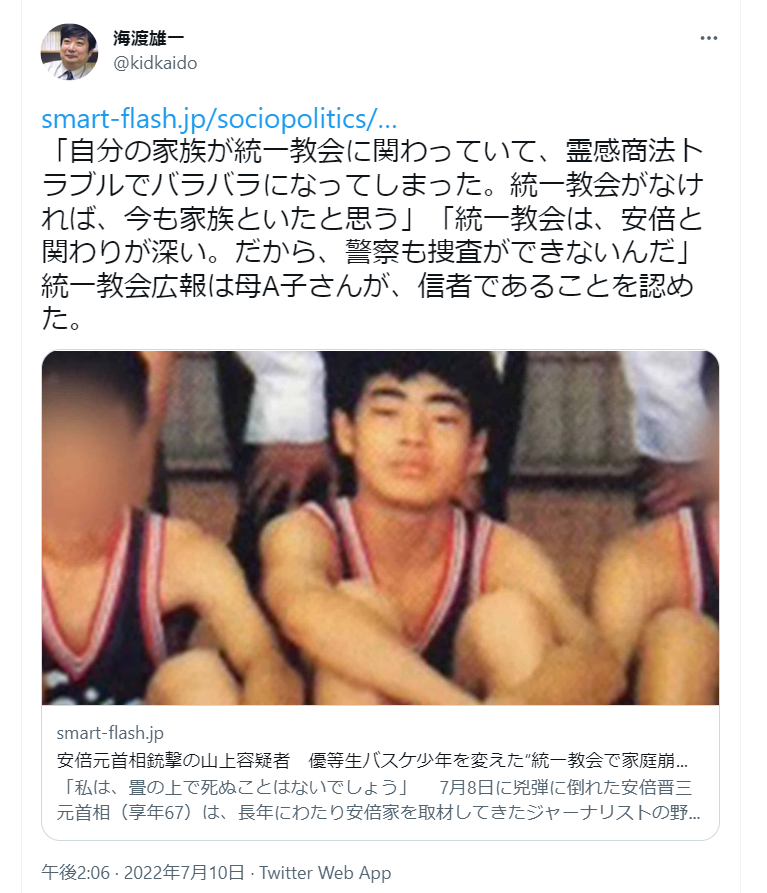 海渡氏の統一教会批判はダブルスタンダードです。ご自身は、立正佼成会系の財団からの助成金で「共謀罪」に反対しています。統一教会を使って、自民党と安倍総理を攻撃したいだけというのが、よくわかります。