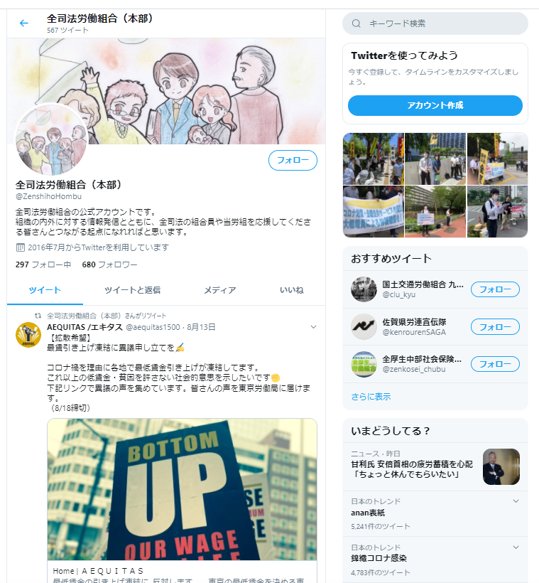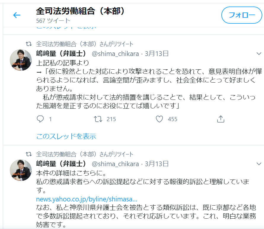 嶋﨑量先生の裁判に関するツイートをせっせとリツイートする全司法労働組合。