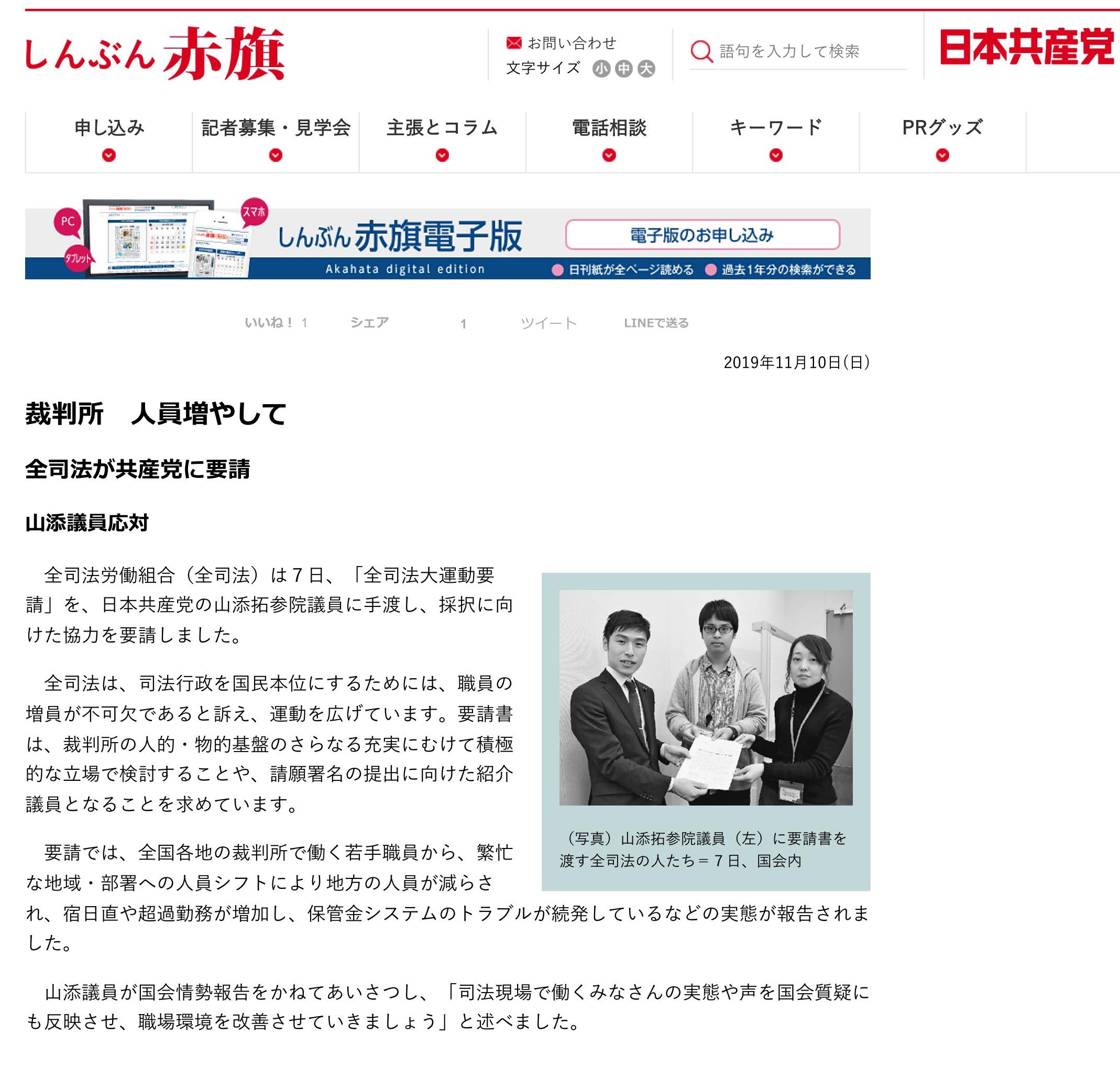 はいはいそれで、全司法の待遇改善やら裁判所の人員増を求めて、裁判官訴追委員にして鉄道法違反して不起訴になった山添拓参議院議員(自由法曹団)に要望書提出よ。一回じゃないの、何回も。てことは増えた人員はみんな共産党支持者ってことかしら。