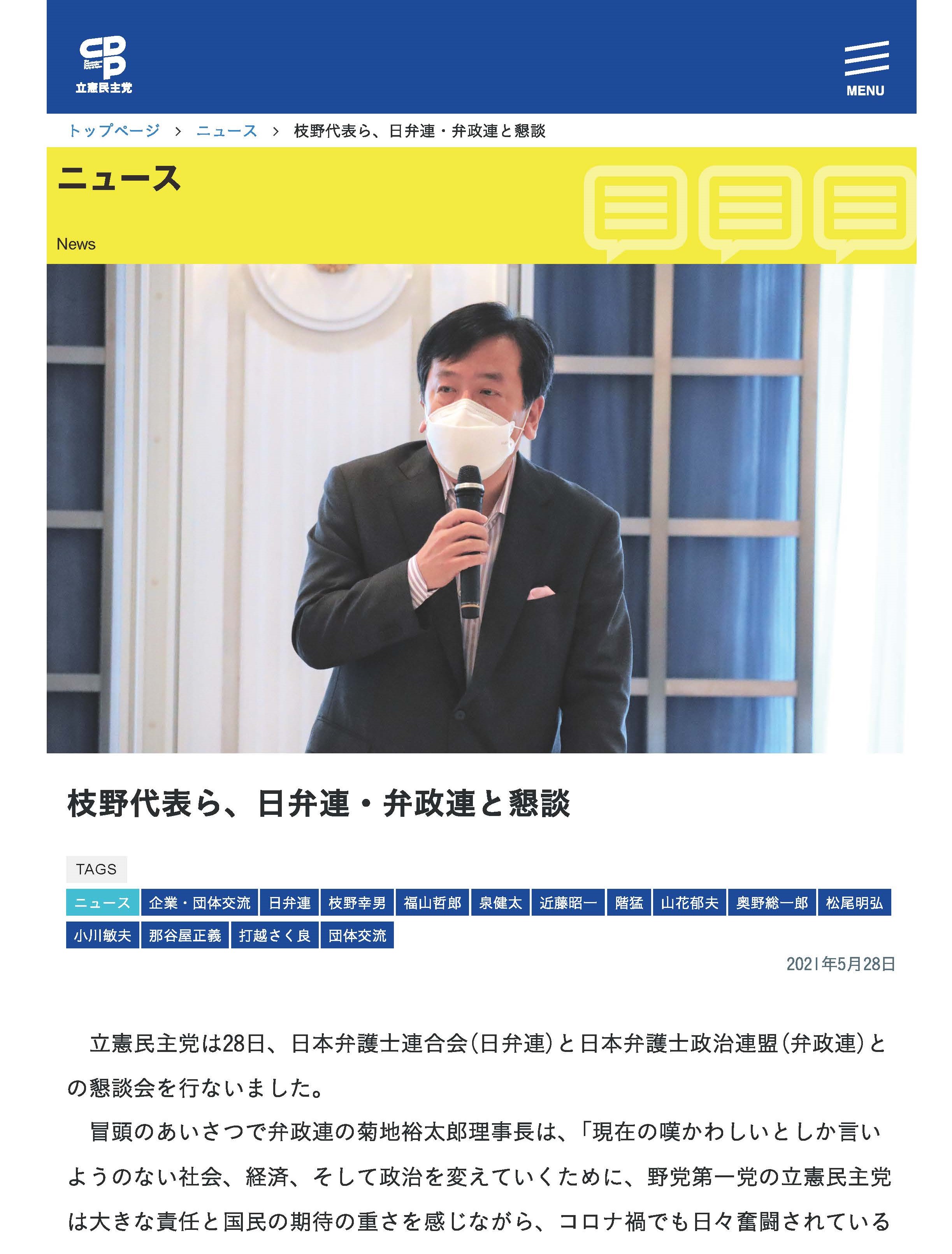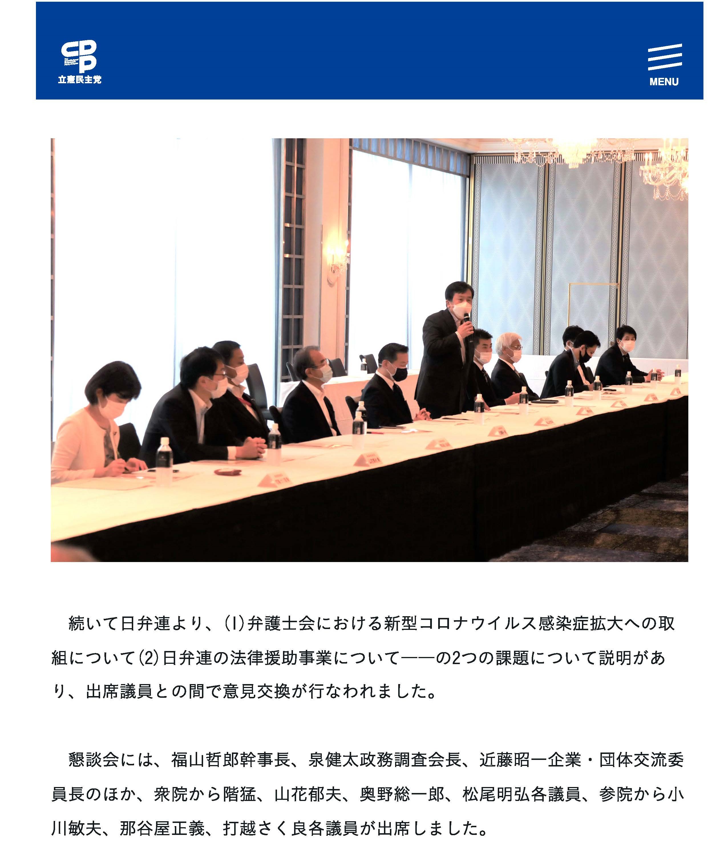 立憲民主党は28日、日本弁護士連合会(日弁連)と日本弁護士政治連盟(弁政連)との懇談会を行ないました。