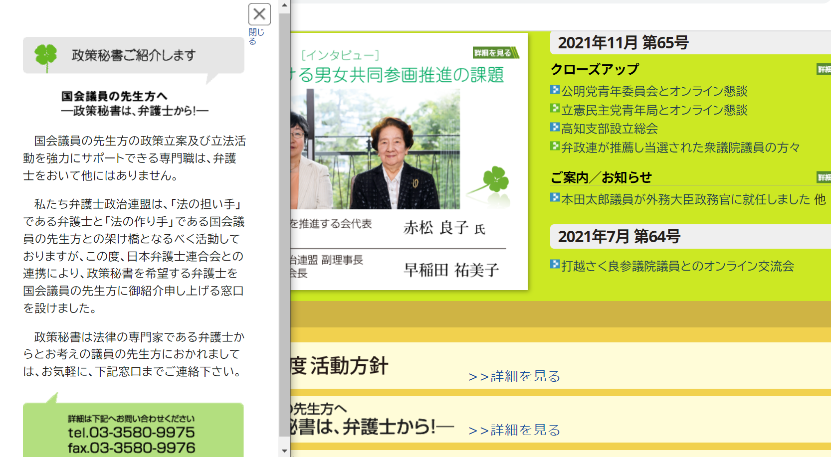 直近10年間において特筆すべきは、弁政連が、日弁連と各政党の国会議員とを橋渡しすることで、立法要請活動が促進されるようになってきたことである。例えば、司法修習生に対する経済的支援や国選弁護報酬の増額、原発損害賠償請求時効特例法等の実現も、弁政連が地道に培ってきた、議員との関係があってこそ実現したものである。