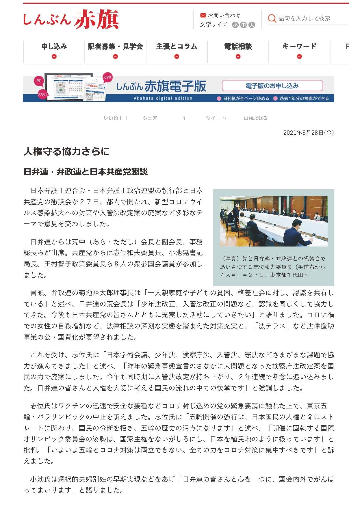 これを受け、志位氏は「日本学術会議、少年法、検察庁法、入管法、憲法などさまざまな課題で協力が進んできました」と述べ、「昨年の緊急事態宣言のさなかに大問題となった検察庁法改定案を国民の力で廃案にしました。今年も同時期に入管法改定が持ち上がり、2年連続で断念に追い込みました。日弁連の皆さんと人権を大切に考える国民の流れの中での快挙です」と強調しました。