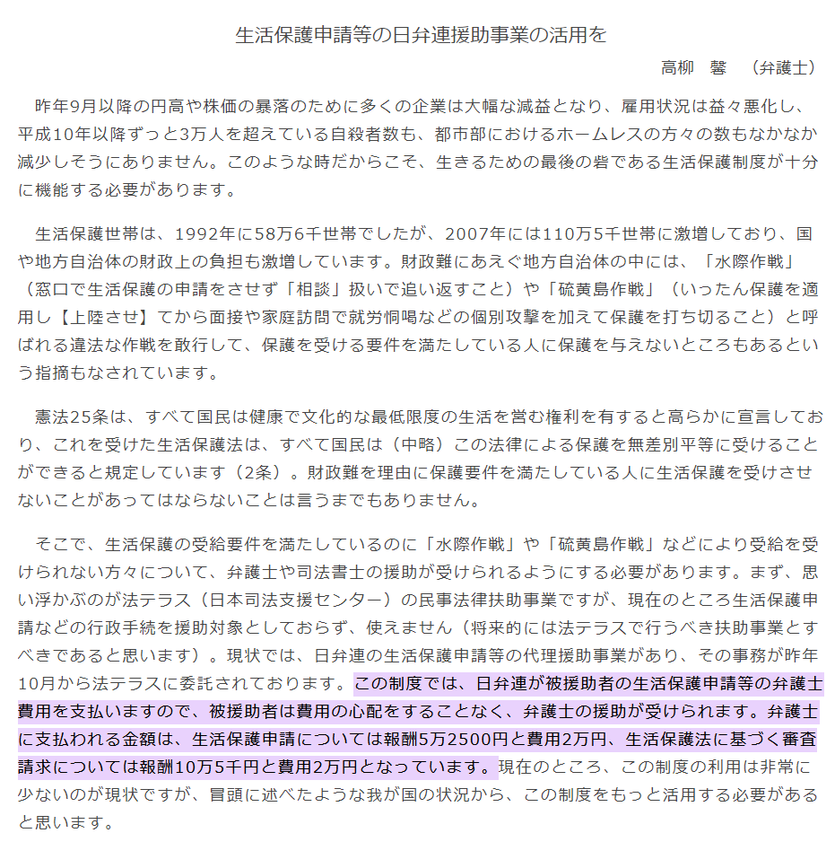 そうそう、日弁連って、弁護士が困窮者の生活保護受給に対応する際の費用を肩代わりしているらしいわよ。どんな困窮者が対象になるのか知らんけど。
