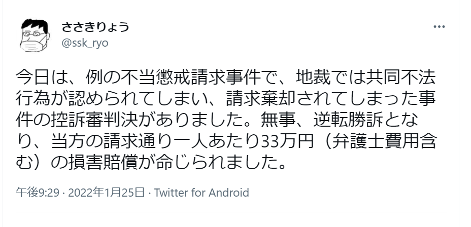 原告佐々木亮弁護士 33万円(一審棄却0円)満額へ無限大の増額