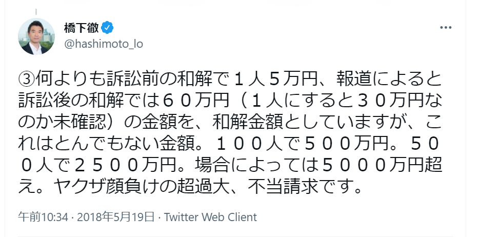 ヤクザ顔負けの高額請求だと指摘する橋下徹弁護士のツイート