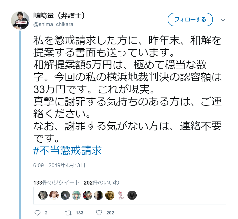 和解金を偉そうに請求する嶋﨑量弁護士と北周士弁護士のツイート