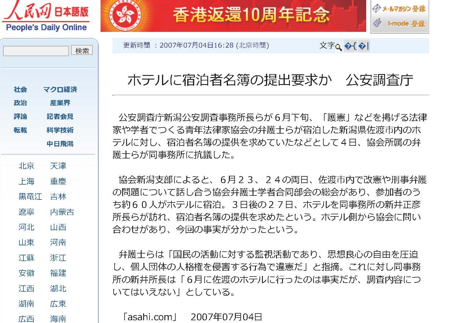共産党機関紙しんぶん赤旗と何故か中国の人民網日本版が騒いだ、名簿の件で公安調査庁に抗議した記事も載せたから。