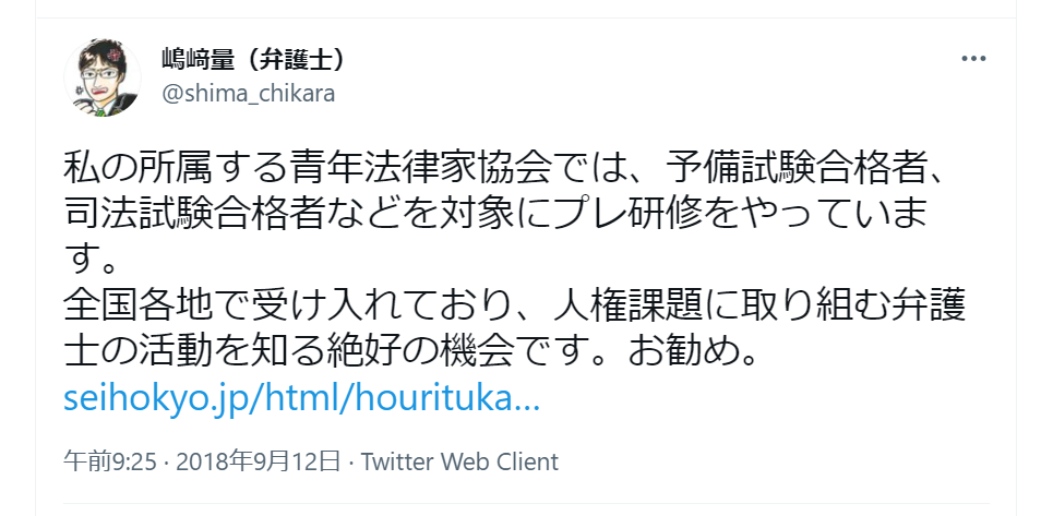 血祭りブラック嶋﨑先生がツイートした青年法律家協会のプレ研修って何かしら?