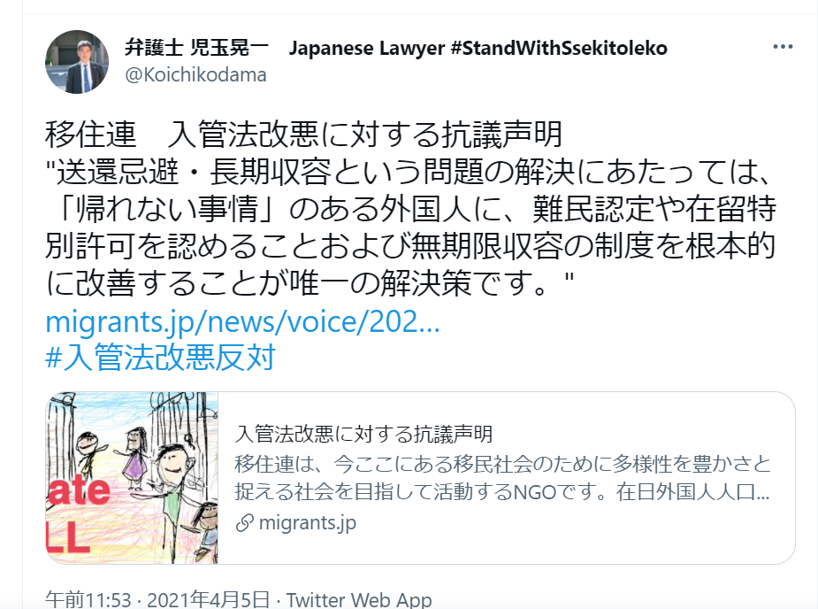 入管無力化ブラック児玉晃一弁護士(マイルストーン法律事務所・東京弁護士会)から。