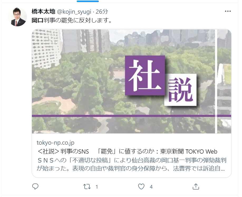 岡口基一判事の弾劾裁判の第一回口頭弁論が3月2日に開かれたようですね。