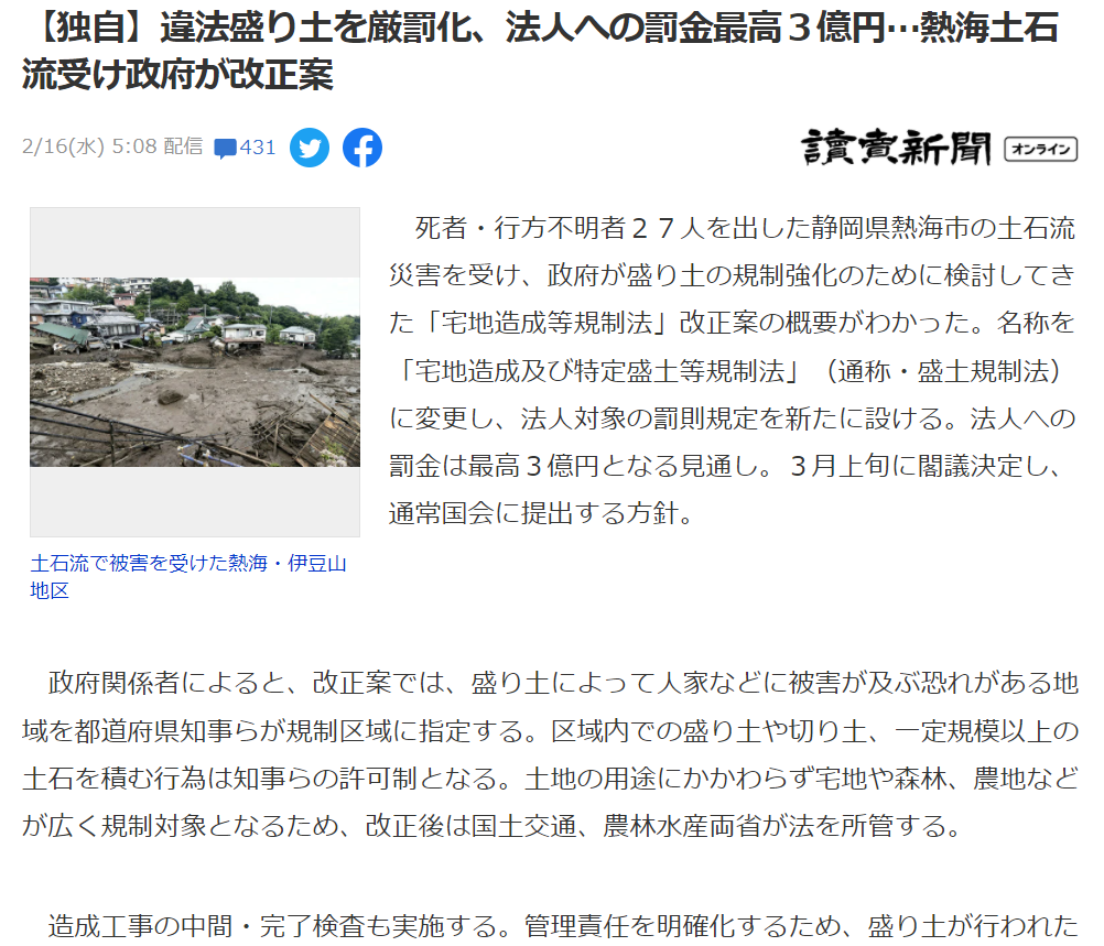 昨年7月、違法な盛り土が記録的な大雨により土石流災害を引き起こし、熱海で死者・行方不明者27人という大きな被害を出しました。政府は違法盛り土を厳罰化し、法人への罰金最高額を3億円に設定しました。