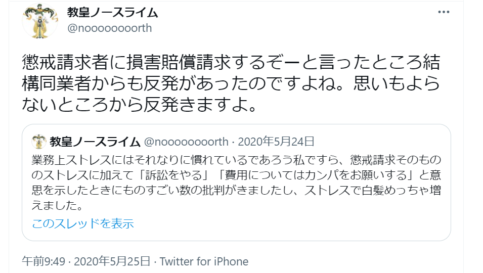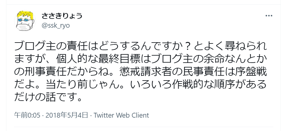 落とし前ブラック佐々木センセ、頭おかしいブラック北センセ、二つ名募集中ブラック小倉センセ、みんな発信者情報開示して情報持ってたじゃありませんかー。なぜなぜ刑事責任追及してきれいに終わらせなかったの?