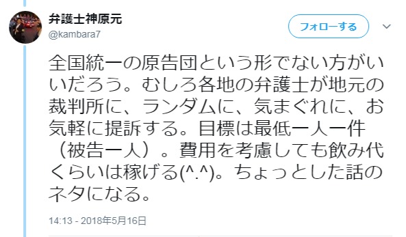 一番最初に提訴したネトウヨコロス神原弁護士は「飲み代稼ぎ」が目的でした。でも実際に提訴した額は50万円で、本件は最初の訴訟で棄却。この時、裁判所にはまだ常識が存在していました。