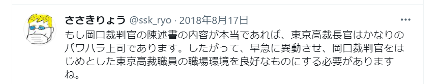 2018年8月に林道晴東京高等裁判所長官をパワハラ上司と決めつける佐々木先生