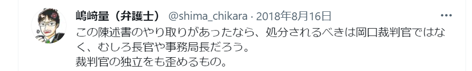 同じく2018年8月に林道晴東京高等裁判所長官は処分されるべきと宣う嶋﨑先生