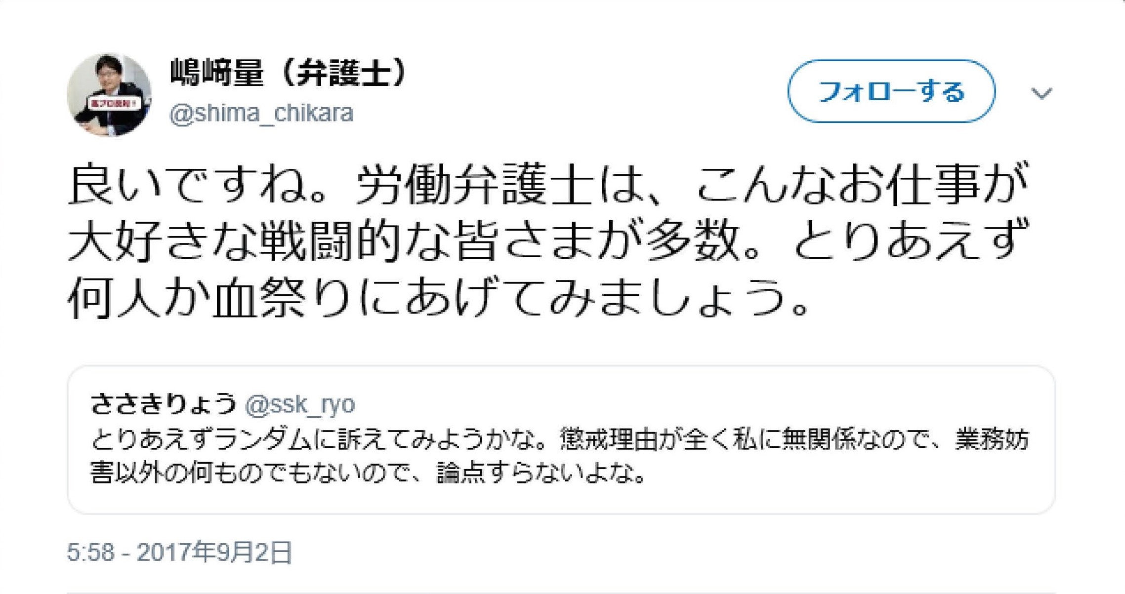 全方位に勇ましいご発言が目立つブラック弁護士の先生方の内で、その戦闘力では、やはり 落とし前・佐々木亮弁護士(旬報法律事務所) と 血祭り・嶋﨑量弁護士(神奈川総合法律事務所)が飛び抜けていて、他の追随を許していないようです。