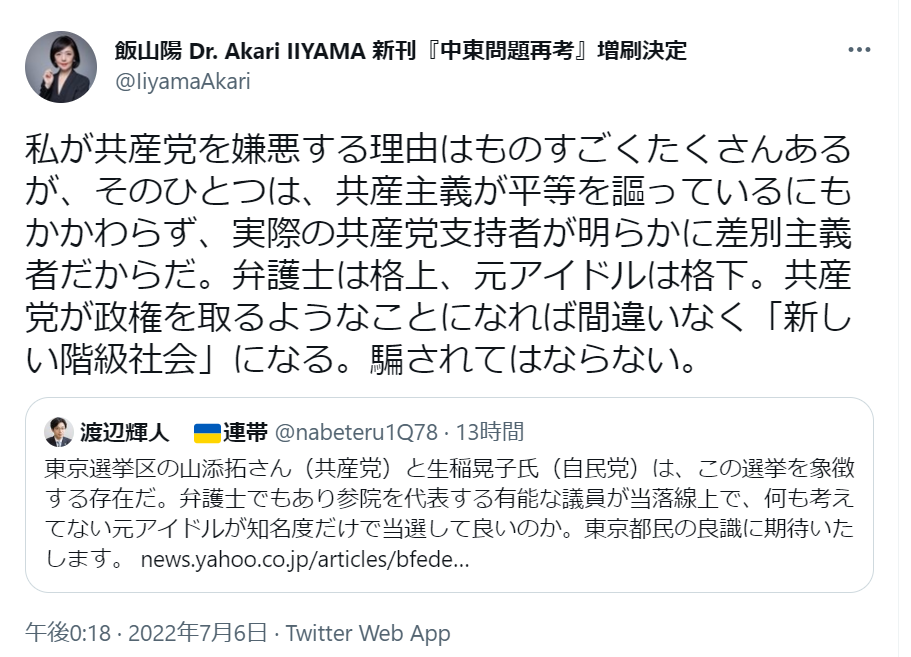 今回ターゲットになったのは生稲晃子さんですね。不法行為2回の前裁判官訴追委員の自由法曹団弁護士山添拓を応援するために、まあ、袋叩きにしています。これって女性差別だし、ハラスメントだと思いますね。あんたら、弁護士でしょ。
