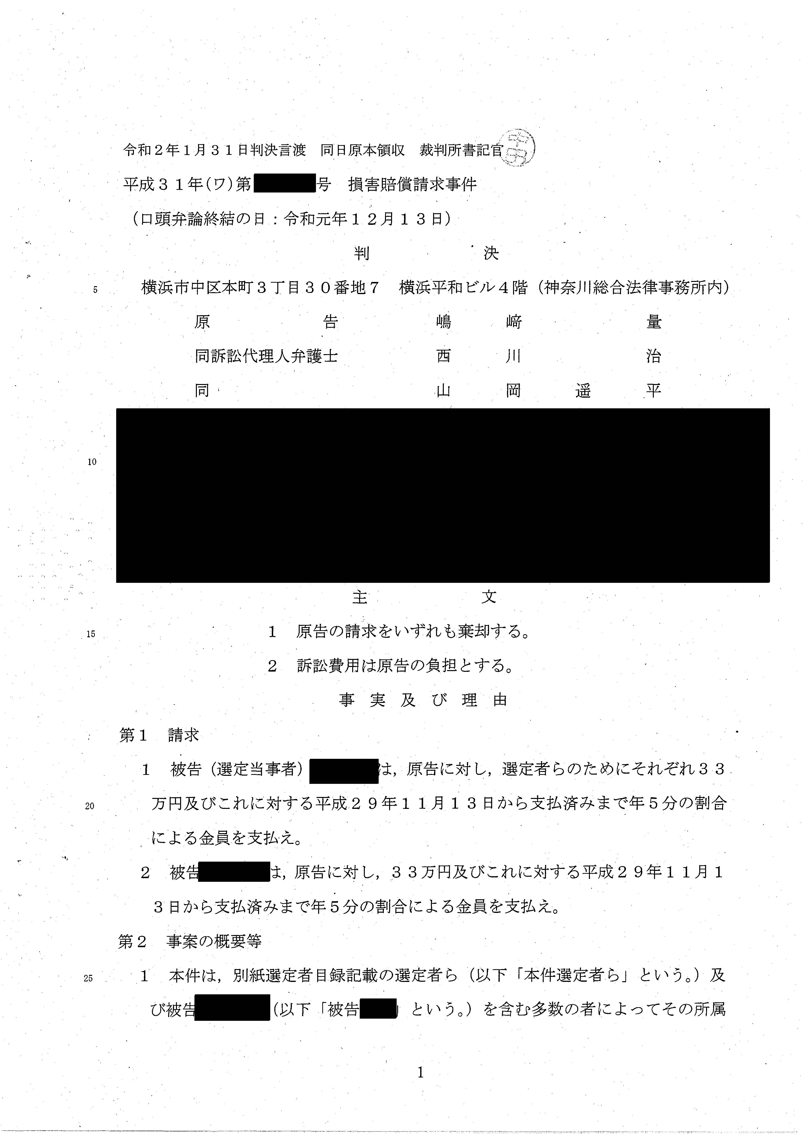 ■原告嶋﨑量弁護士 横浜地裁民事第5部 棄却判決 令和2年1月31日