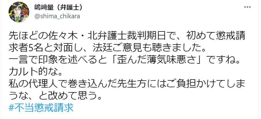 「そういえば、その裁判の様子を嶋﨑量弁護士がツイッターでつぶやいてたわ」