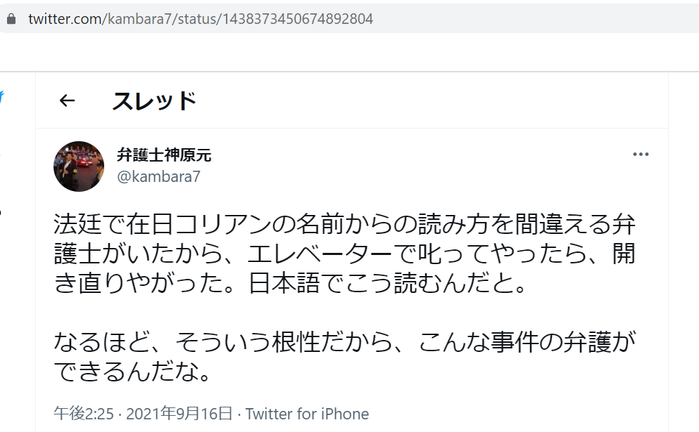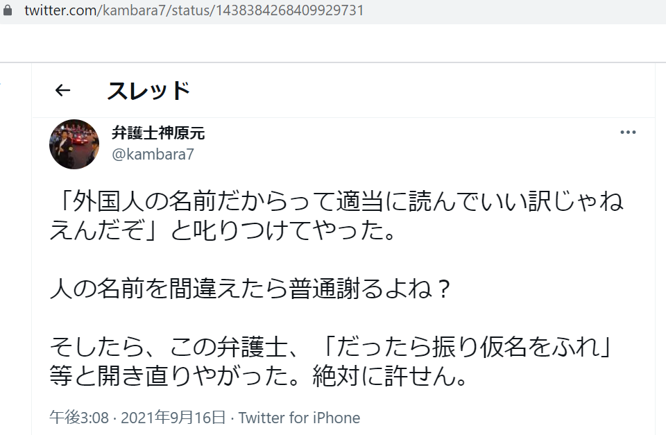 ネトウヨコロスブラック神原元弁護士(武蔵小杉合同法律事務所・神奈川県弁護士会)が、何やらひどくご乱心にあらせられる模様。