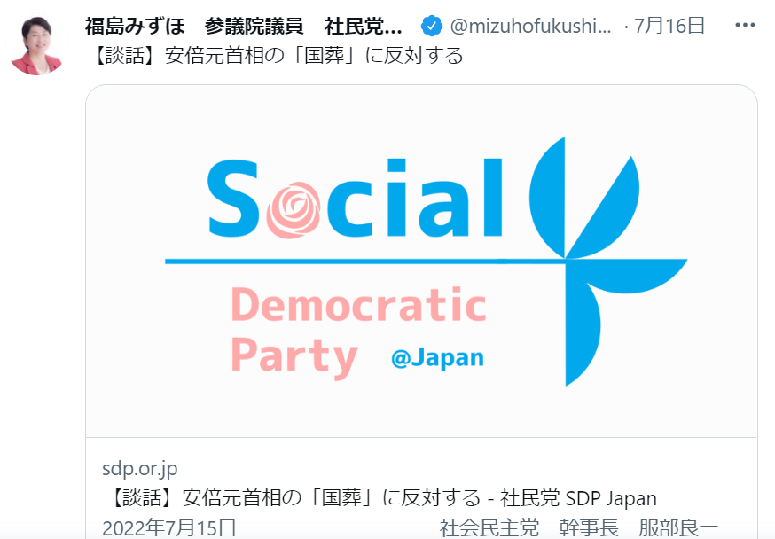 最後にのせた「福島みずほの安倍総理国葬反対」ですが、議席たくさんとって、国会で発議して、内閣不信任案を通すという、正規のプロセスでやったらいいでしょう。意見を通すとはそういうこと。ルール通りやれ。