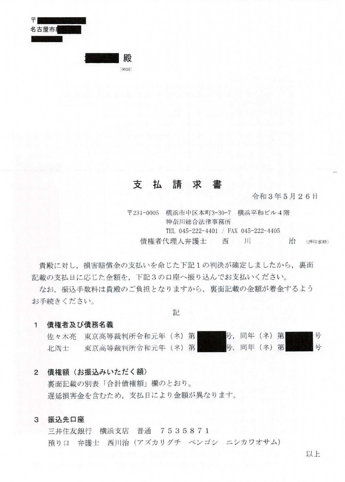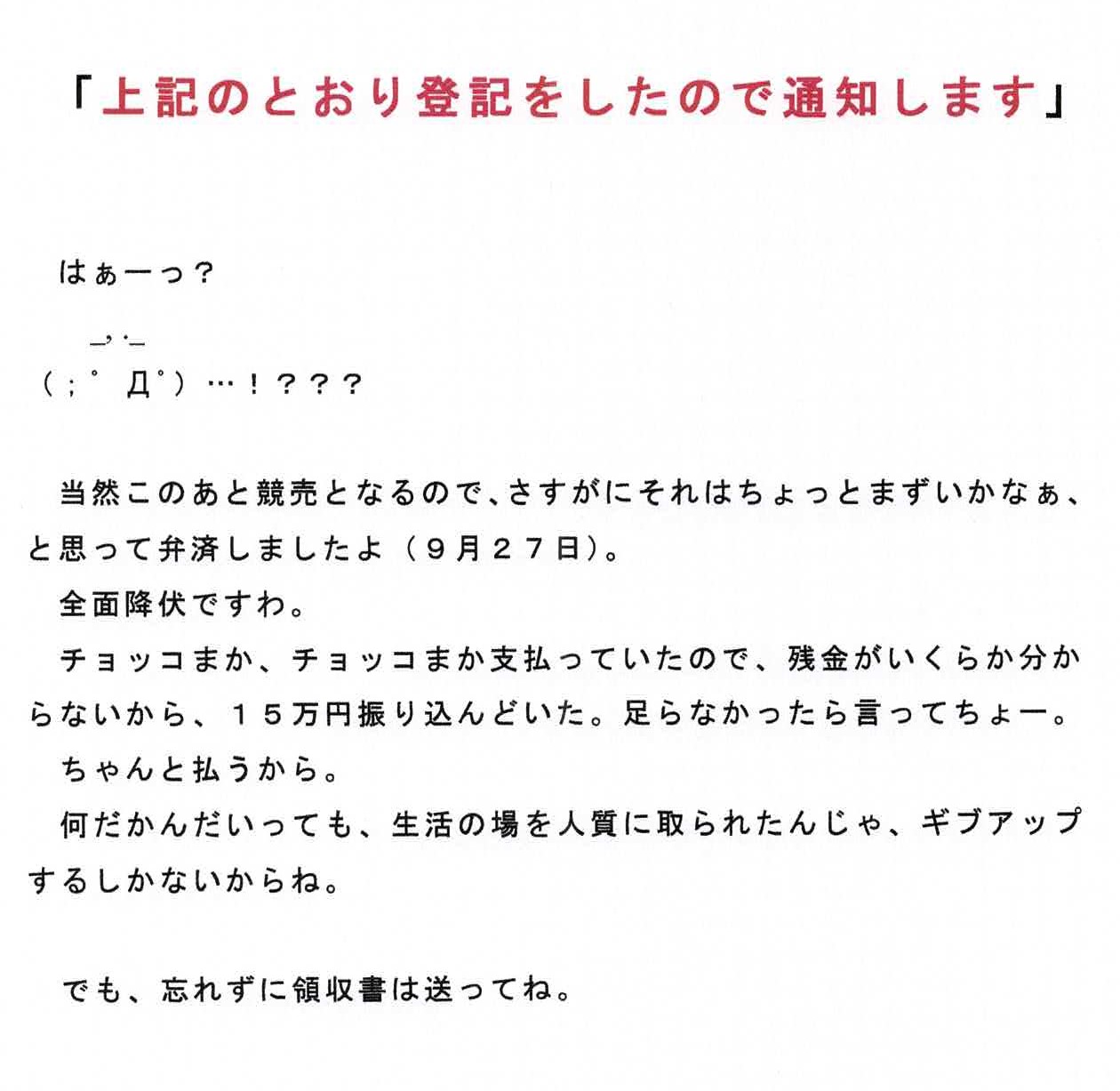 ※不動産に関する強制執行はこれで3件目となる。先の2件は競売手続きが進められていた。100倍以上の価値を持つ不動産を競売にかけてまで、賠償金を回収しようとするのは、マフィアやテロリストが好む見せしめそのものである。原告と代理人弁護士は、異様な見せしめを好む点において、マフィアやテロリストと同類である。