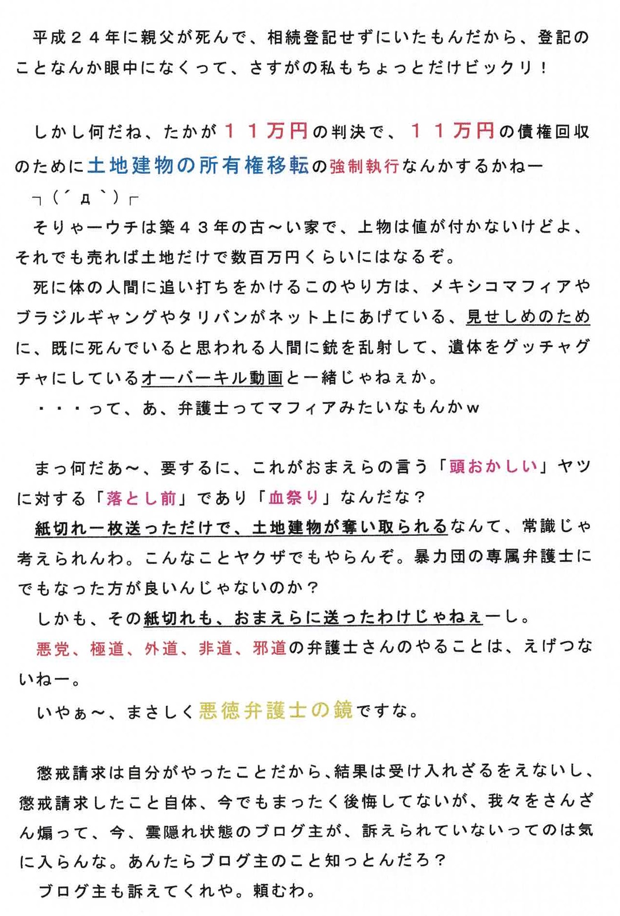 本当に本物の、ヤクザ顔負けの手口です。皆様は弁護士にご用心!